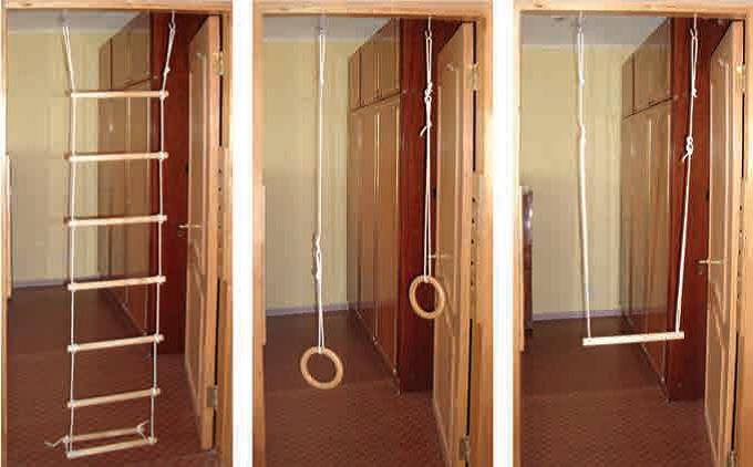 Спортивный комплекс Атлет-Компакт в дверной проем без перекладины. Включает в себя: веревочную лестницу, трапецию, кольца гимнастические. Устанавливается в дверном проеме. Материал — береза, сосна. Вес: 2 кг.