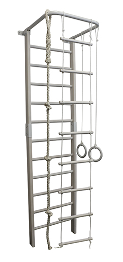 Спортивный комплекс «Атлет» в белом цвете. Выполнен из цельного массива дерева. Включает в себя: шведскую стенку, турник, канат, кольца, веревочную лестницу. Размеры: высота – 2400 мм; ширина – 600 мм; Ø перекладины – 32 мм; растояние от стенки до турника (вынос) – 700 мм. Вес: 18 кг.