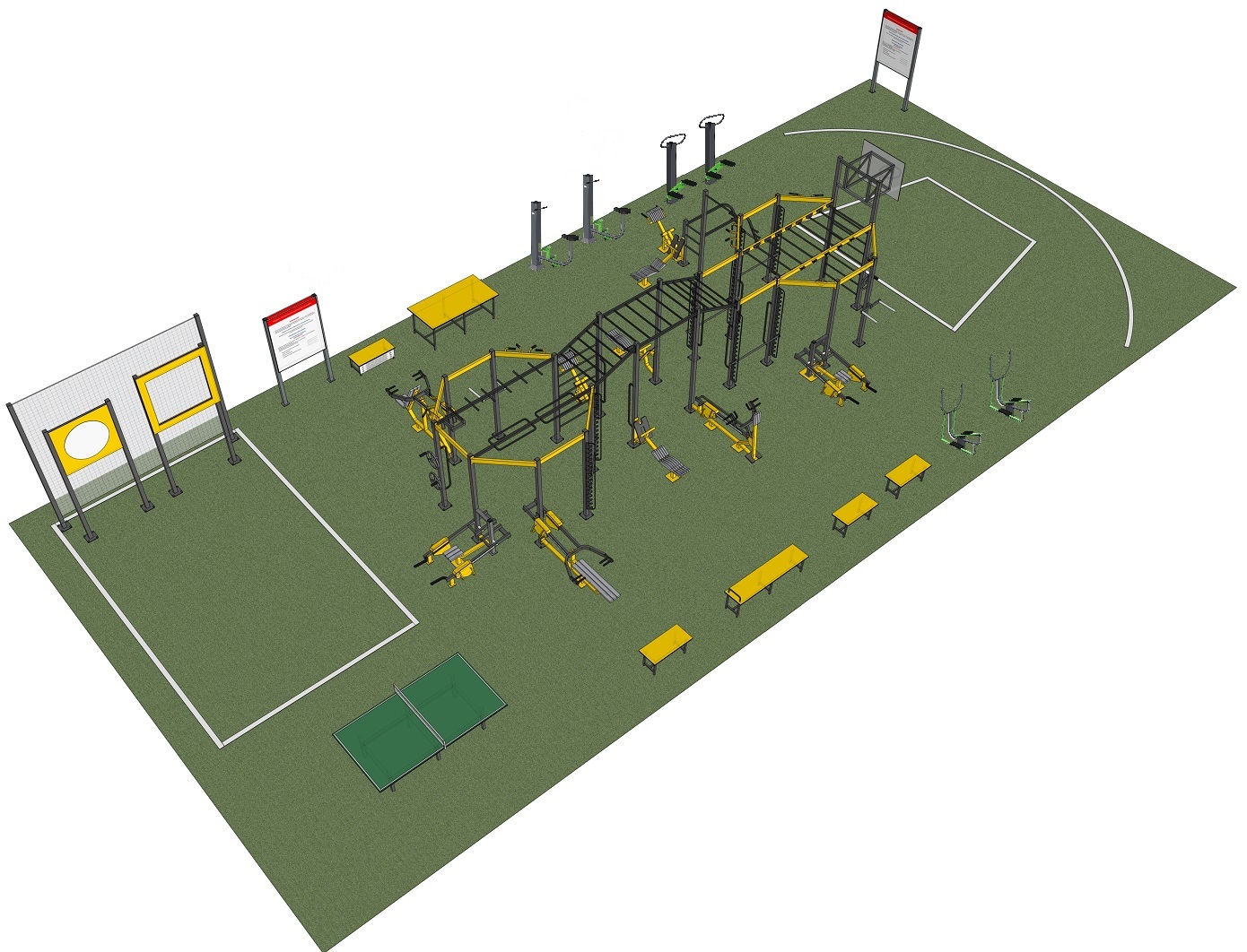 Производим на заказ. Состав оборудования: Мишень для мячей — 2 шт. Информационный щит — 2 шт. Скамья для наклонов с линейкой Велотренажер — 2 шт. Степпер — 2 шт. Эллиптический тренажер — 2 шт. Теннисный стол Скамья для пресса Скамья — 3 шт. Силовая рама на 22 вертикальных стойках с баскетбольным щитом и интегрированными тренажерами в составе: