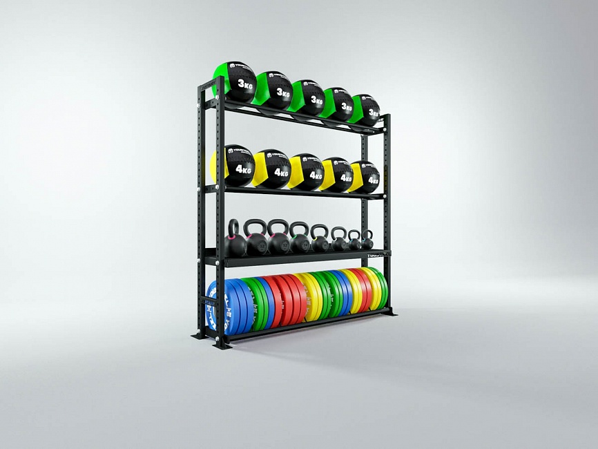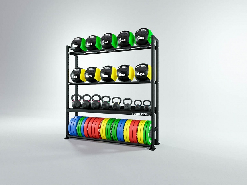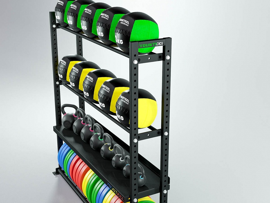 Модульные стеллажи YOUSTEEL – универсальное и простое решение по организации эффективного хранения оборудования в зале. Они отлично вписываются в интерьер любого кроссфит-зала.