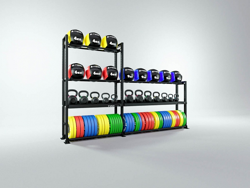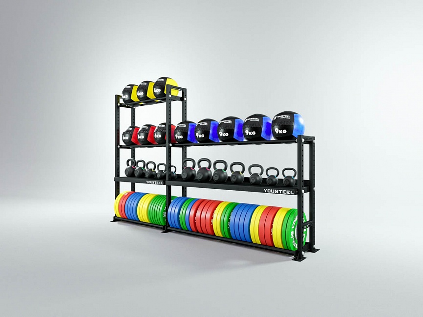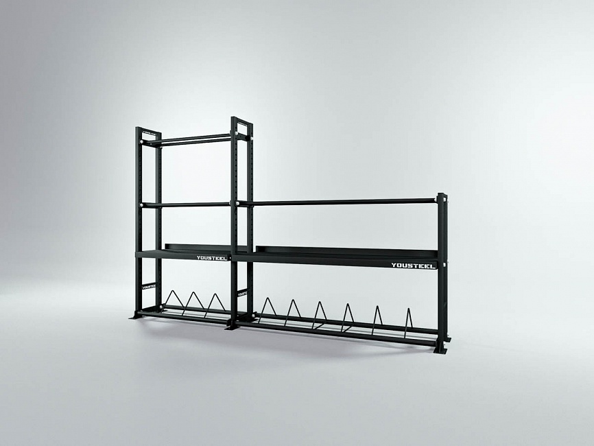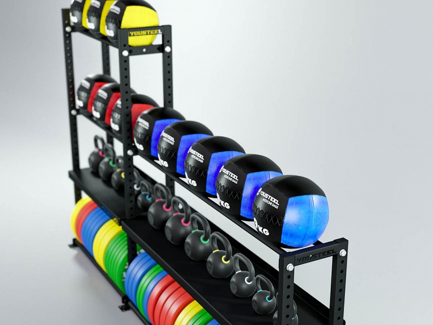 Модульные стеллажи YOUSTEEL – универсальное и простое решение по организации эффективного хранения оборудования в зале. Они отлично вписываются в интерьер любого кроссфит-зала.