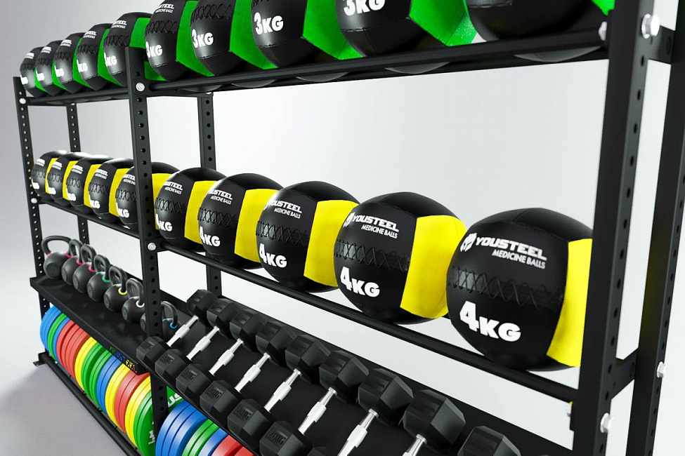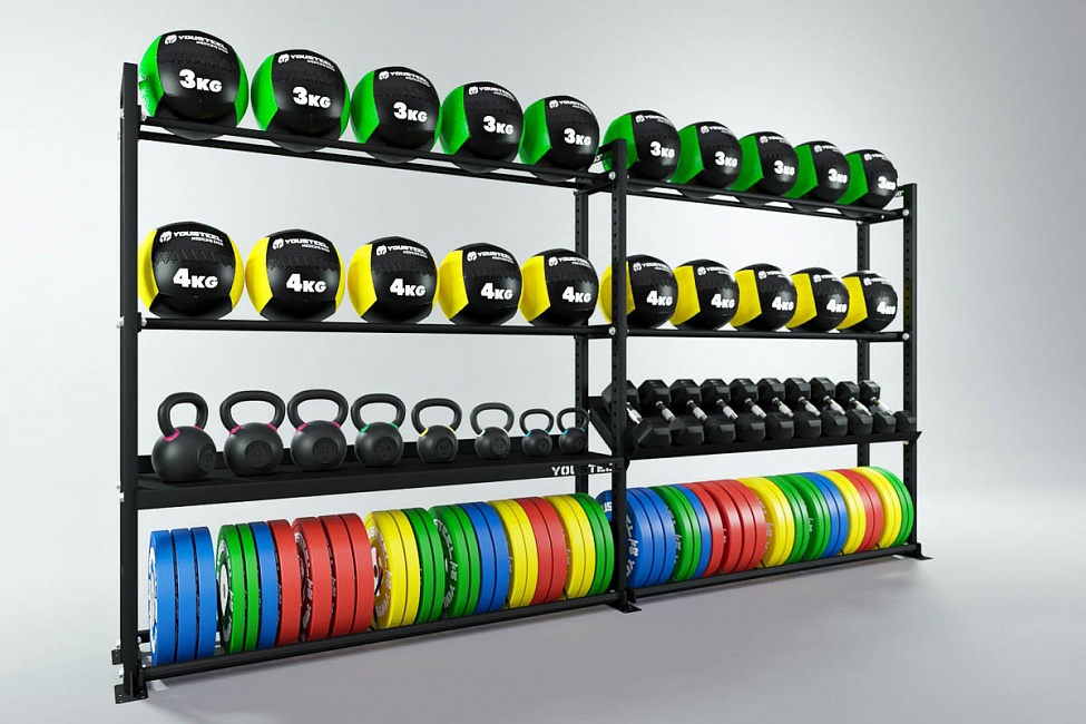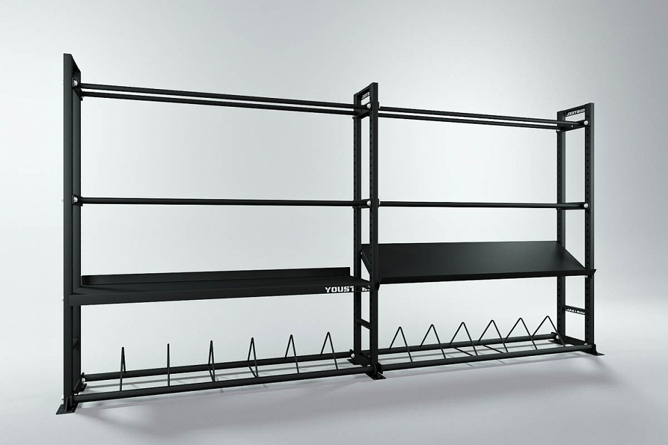 Модульные стеллажи YOUSTEEL – универсальное и простое решение по организации эффективного хранения оборудования в зале. Они отлично вписываются в интерьер любого кроссфит-зала.