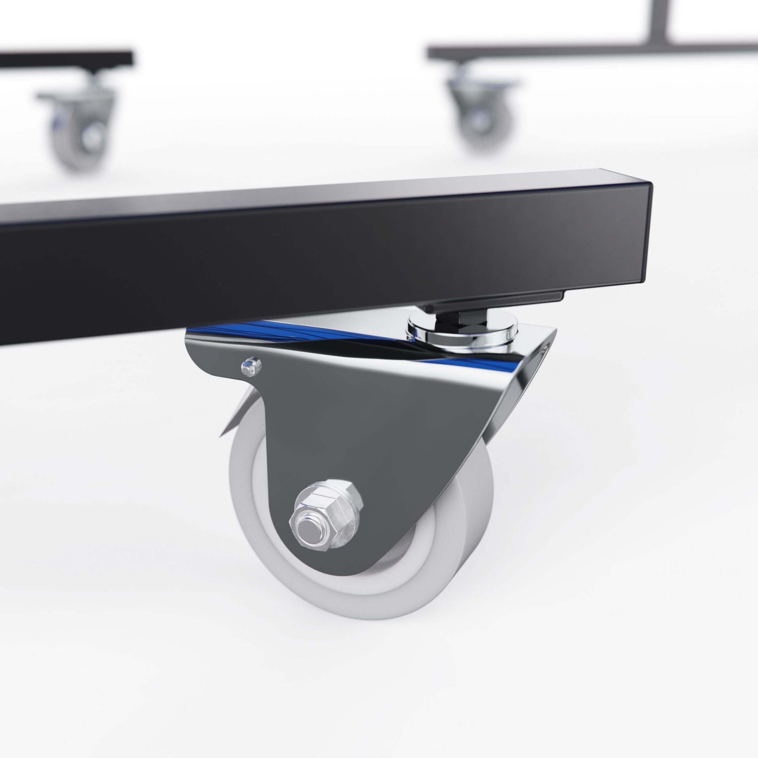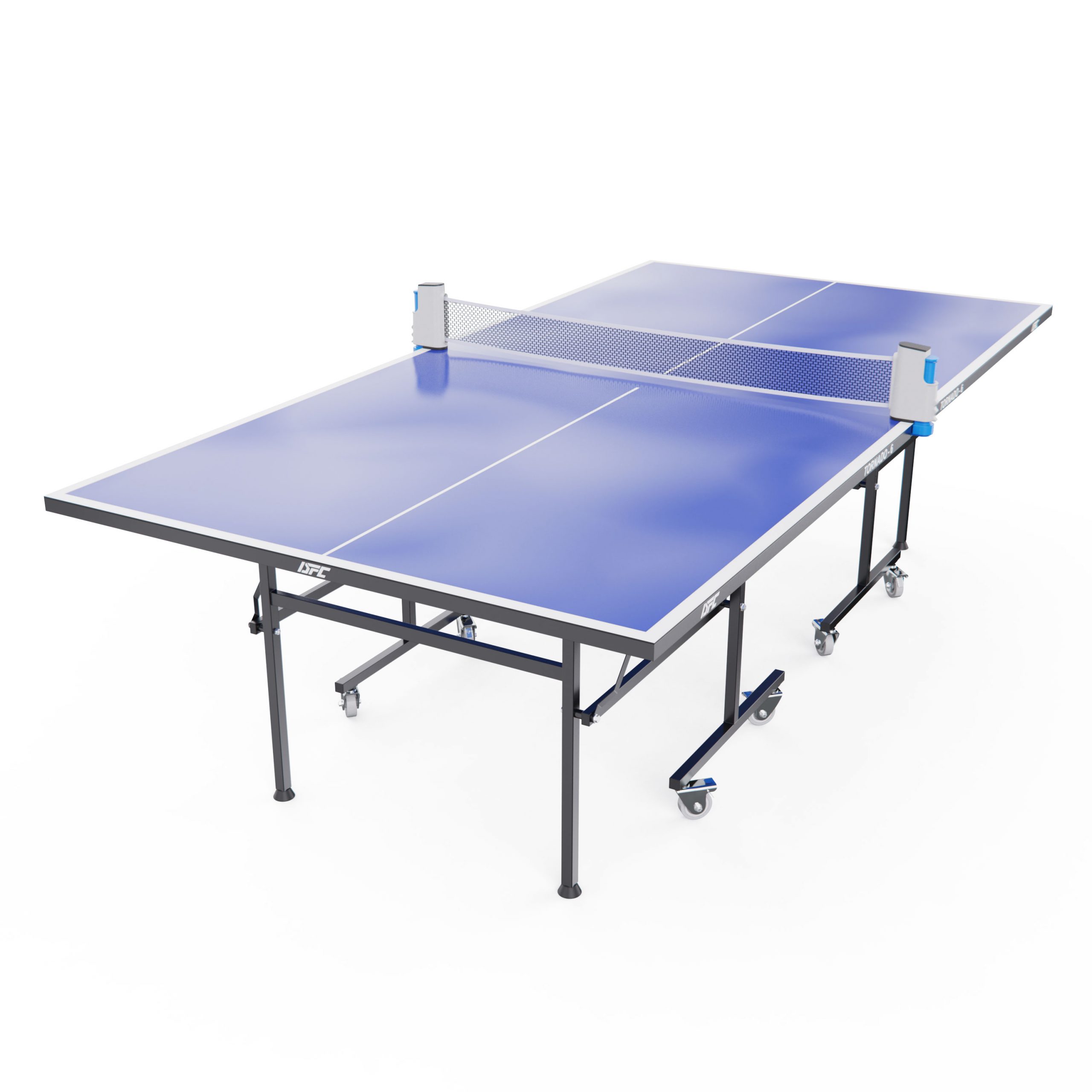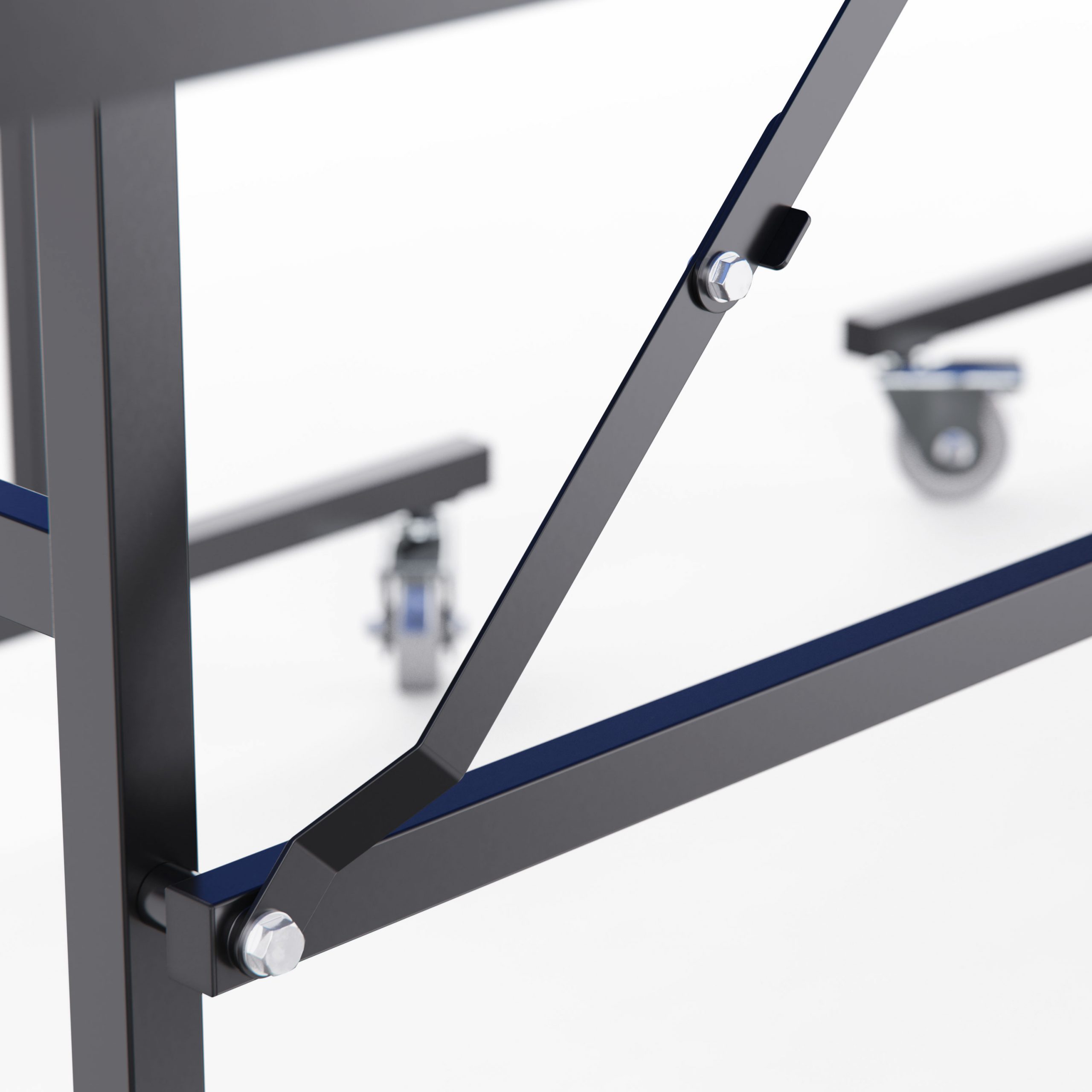 Столешница толщиной 4 мм обеспечивает ровный, стабильный отскок мяча и комфортную игру как для начинающих, так и для опытных игроков. Прочная стальная рама и регулируемые ножки обеспечивают устойчивость даже на неровных поверхностях. Каждая ножка регулируется по высоте до 15 мм, что позволяет точно выровнять стол для идеального игрового положения. Для дополнительной безопасности предусмотрены блокируемые колёса — они надёжно фиксируют конструкцию, предотвращая смещение во время игры.