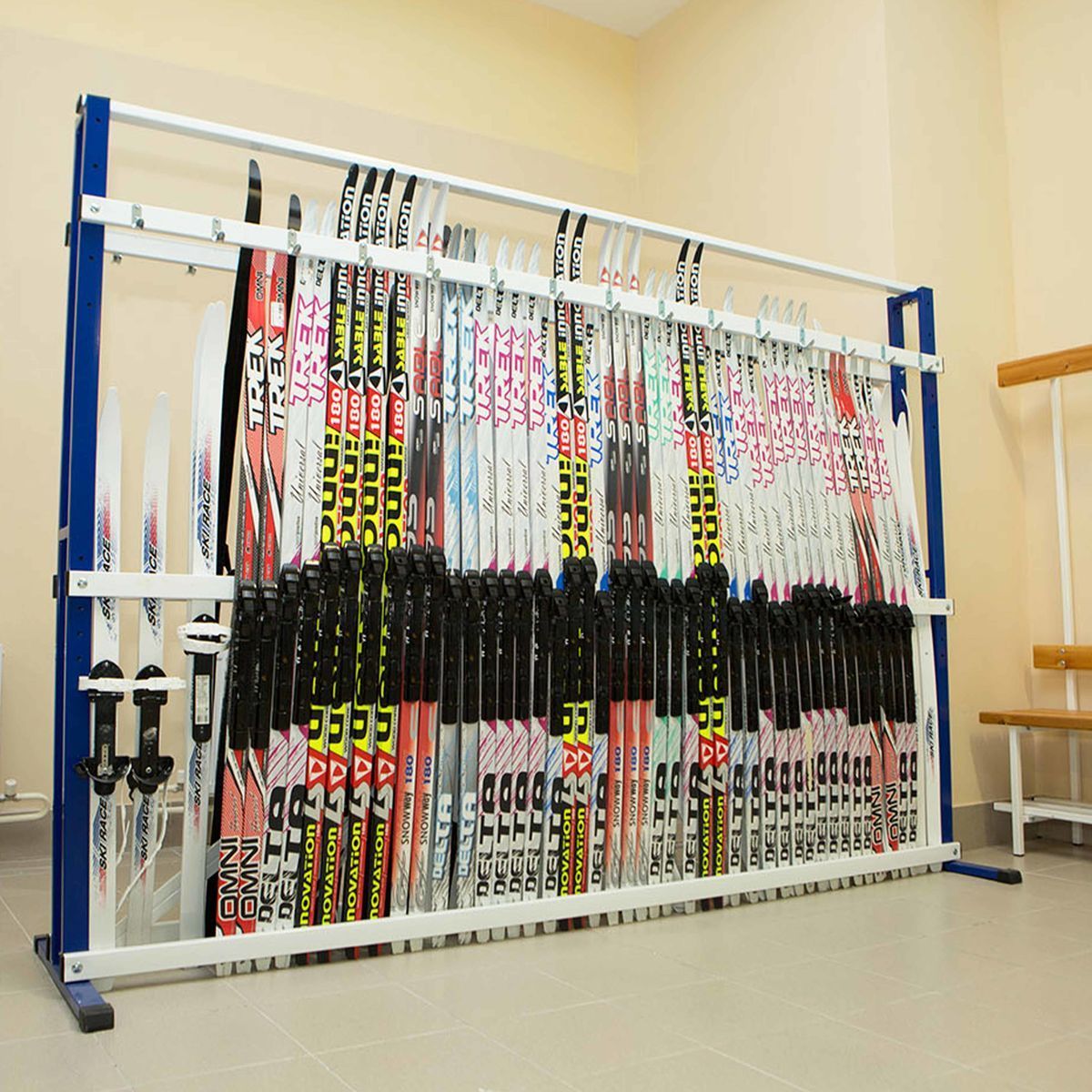 Стойка предназначена для хранения беговых лыж и лыжных палок в спортивных учреждениях, предприятиях и т.д., с возможностью регулировки по высоте, для разных типов лыж.