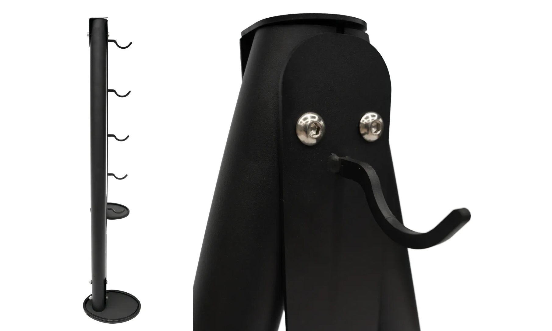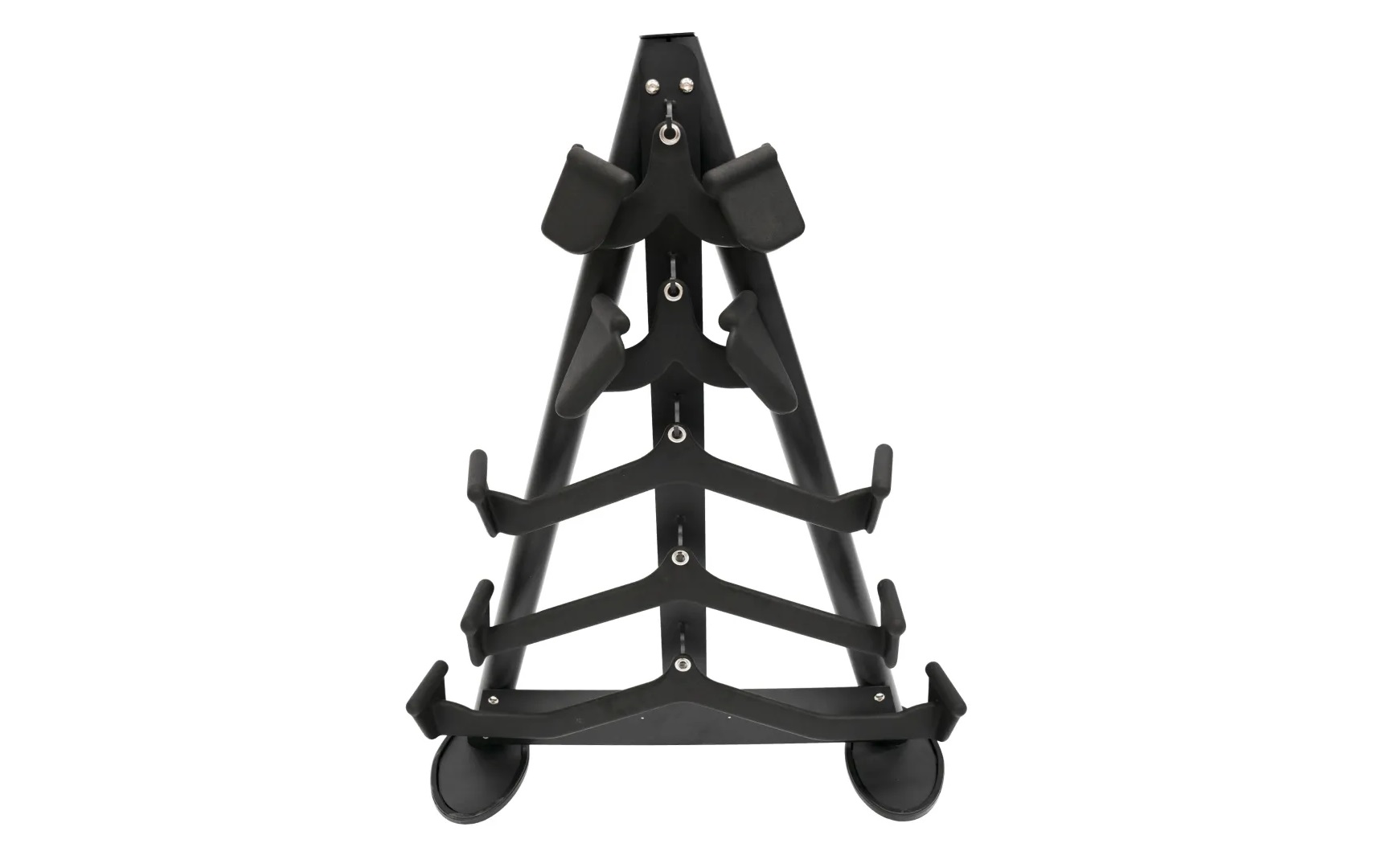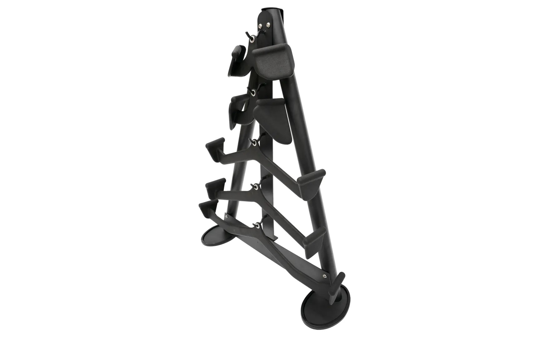 Вертикальная стойка для хранения ручек блочных тренажеров, имеет 5 крючков для подвесного хранения. Изготовлена из стального профиля овальной трубы 30х80мм, толщиной стенок металла 2.5мм, с нанесением порошковой краски. Пятки ножек снабжены резиновыми накладками, которые обеспечивают устойчивость и не повреждают напольное покрытие. Треугольная форма конструкции, позволяет равномерно распределять нагрузку и исключает опрокидывание во время эксплуатации. Вертикальное хранение экономит свободное пространство в спортзале.