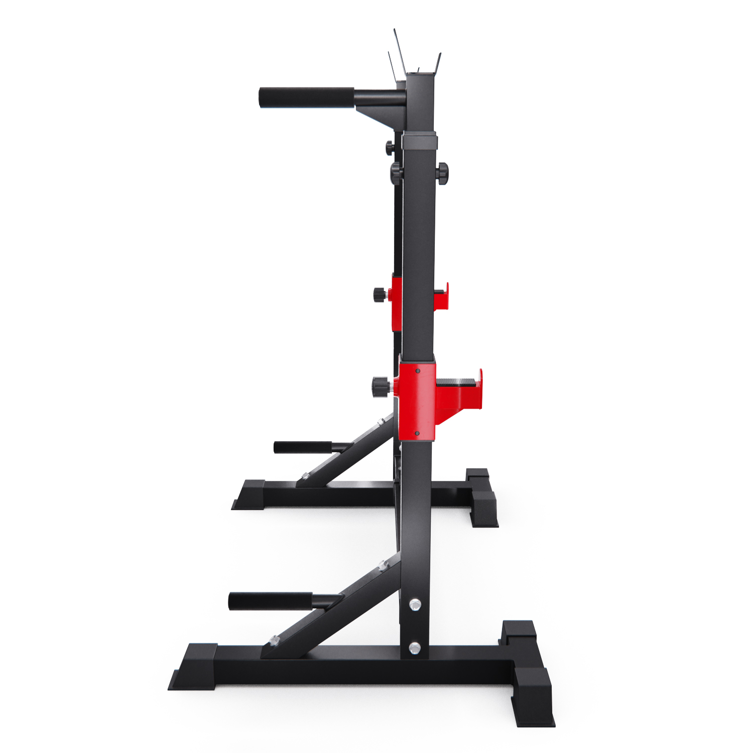 Стойка под штангу с брусьями DFC AKYEN J07 для домашнего использования. Шаг регулировки высоты 5 см, а регулировки ширины – 16,5 см. Регулируемая стойка для приседаний AKYEN 3-в-1.