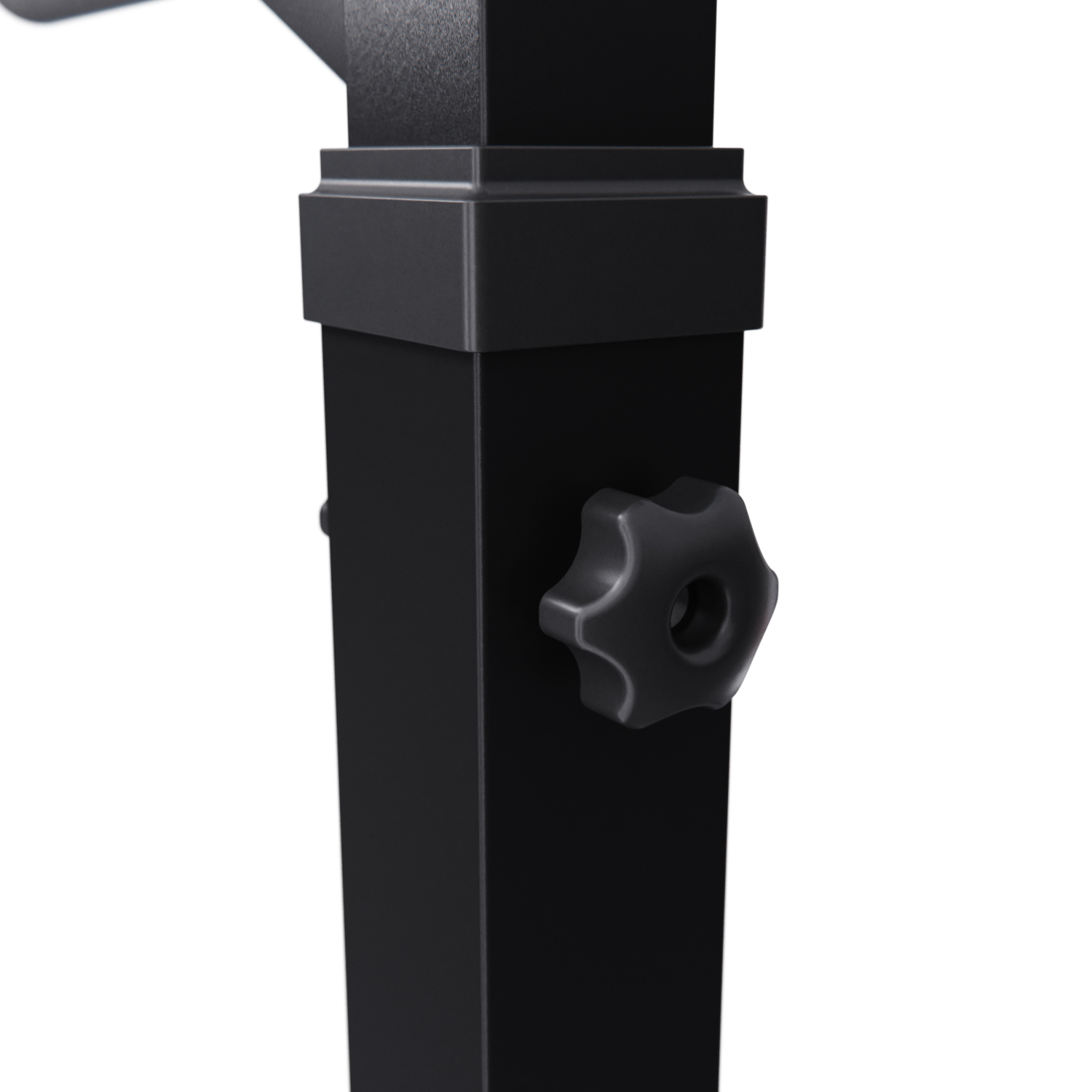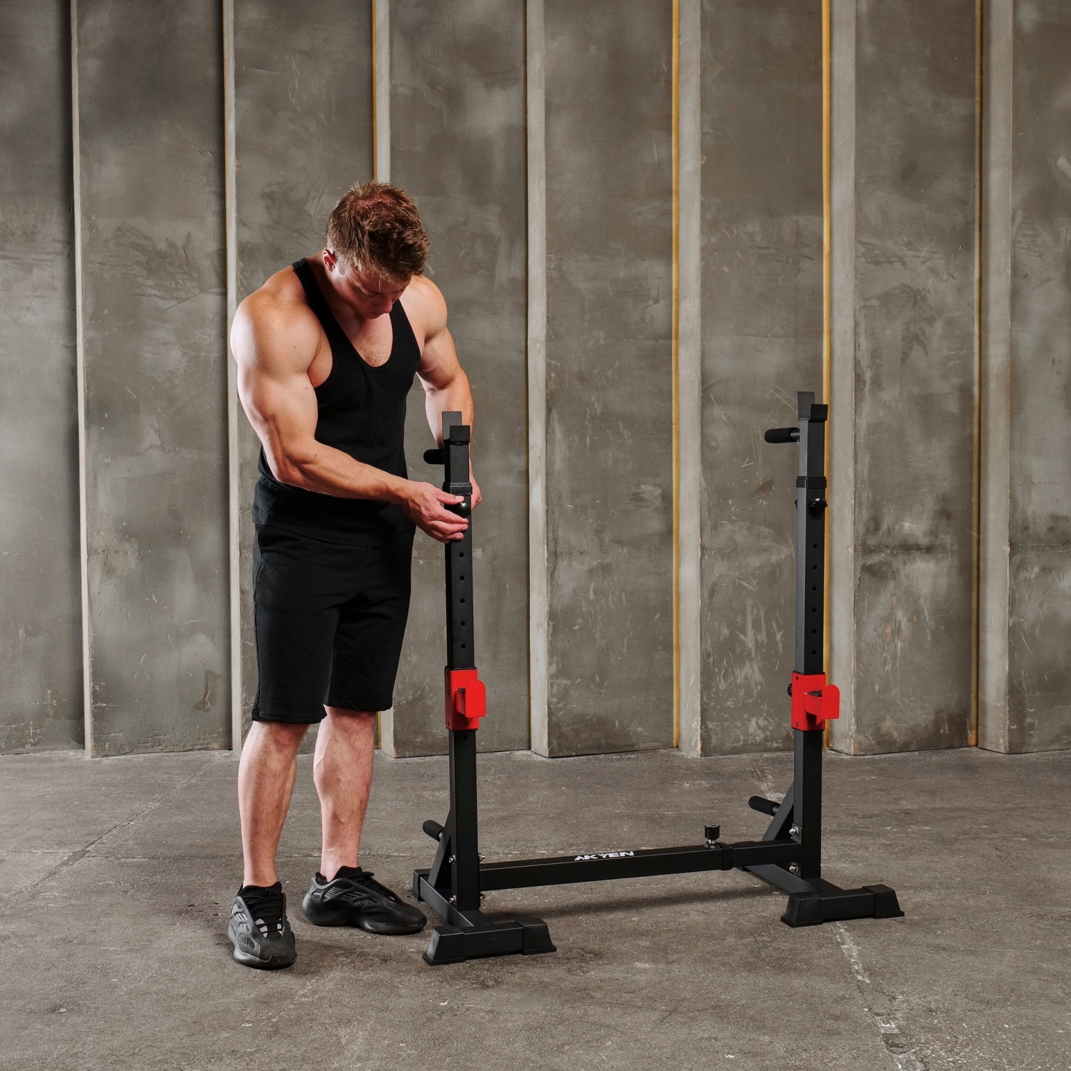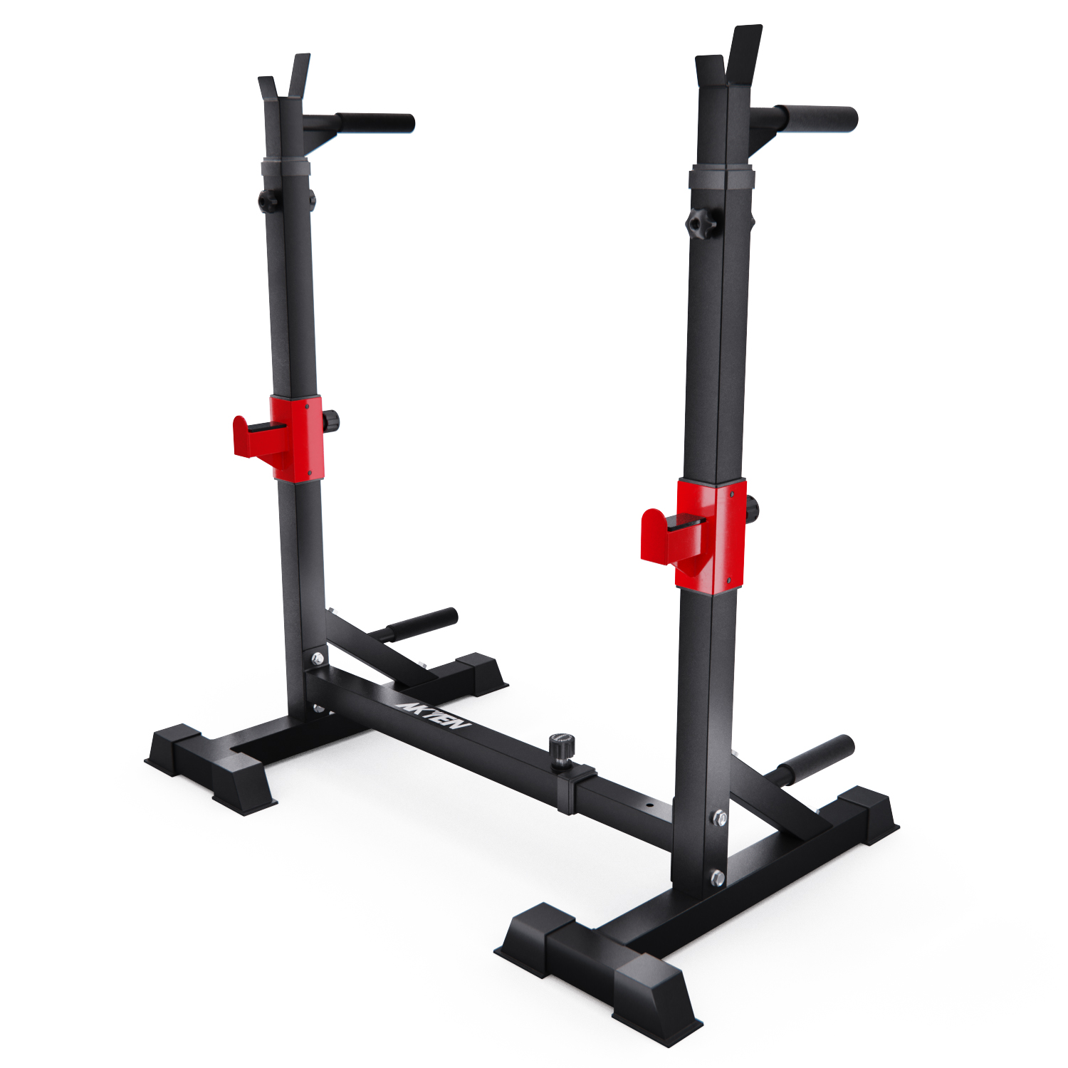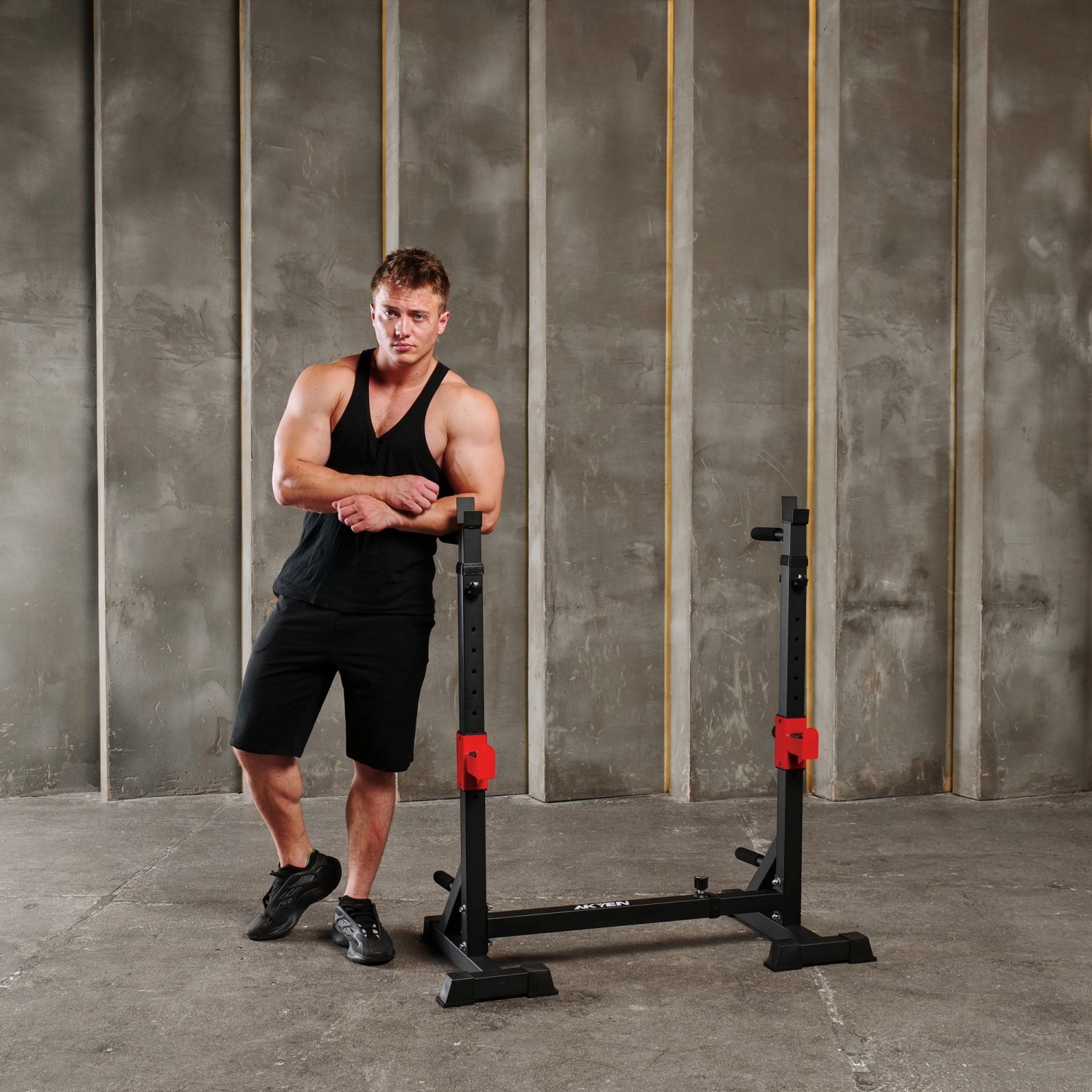 Многофункциональная стойка для штанги 3-в-1: позволяет легко выполнять различные упражнения, включая жим лежа, жим от плеч, приседания, подъемы над головой, упражнения со штангой, отжимания на брусьях, подтягивания, отжимания. Высота регулируется от 109,7 до 181,9 см, 15 уровней; а ширина от 71,8 до 122,2 см, 4 уровня.