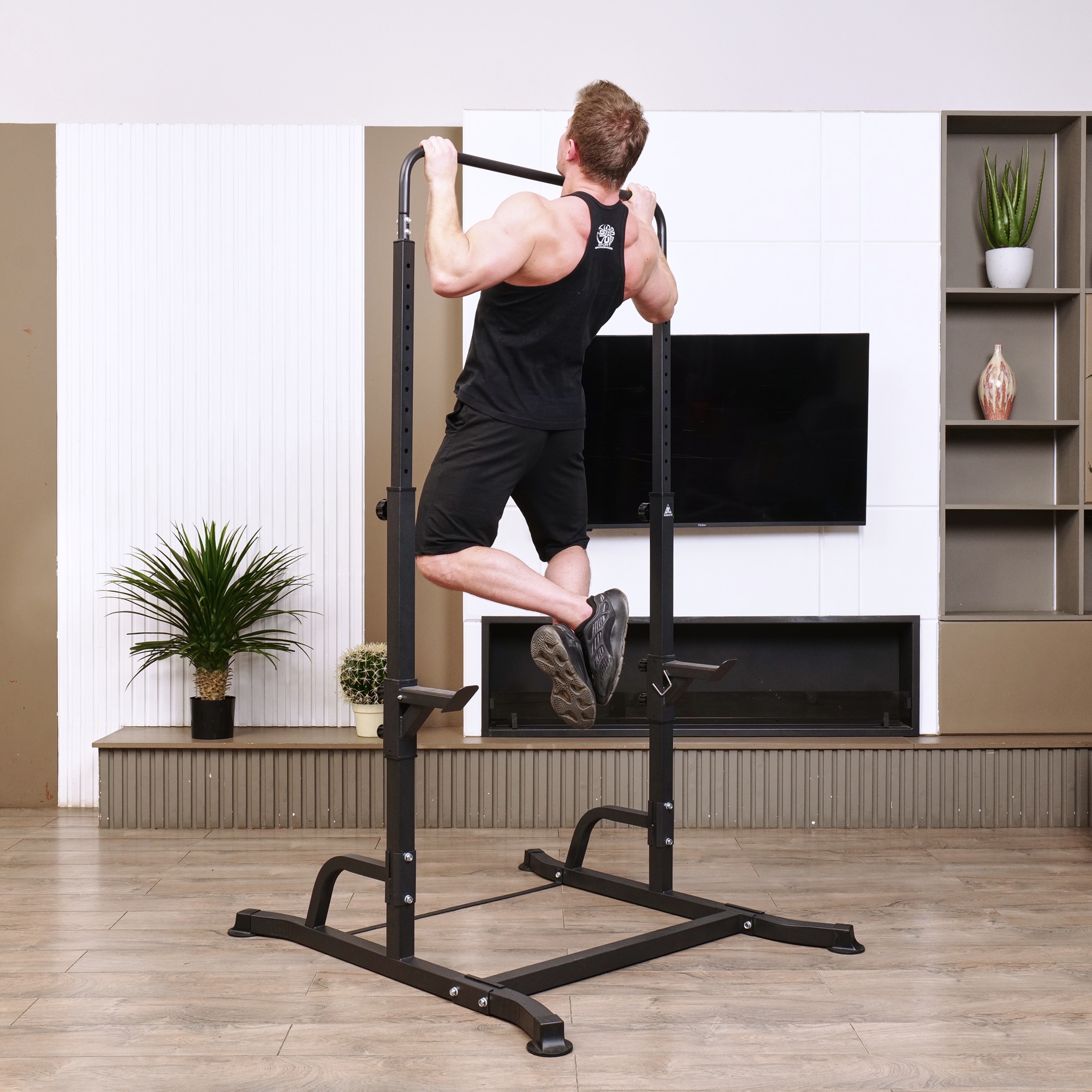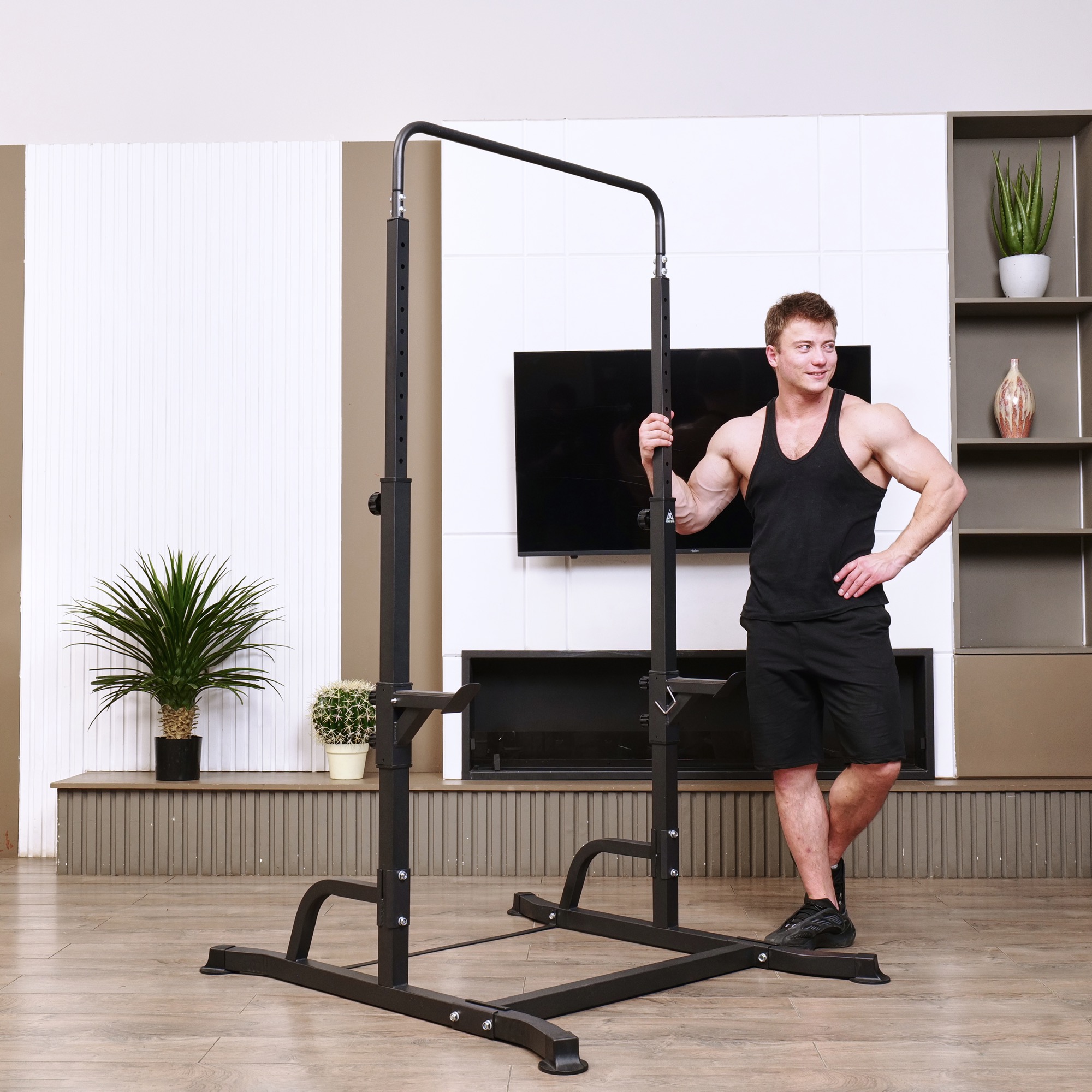 Позволяет выполнять широкий спектр упражнений: приседания со штангой, жим и другие. Так же используется как турник.