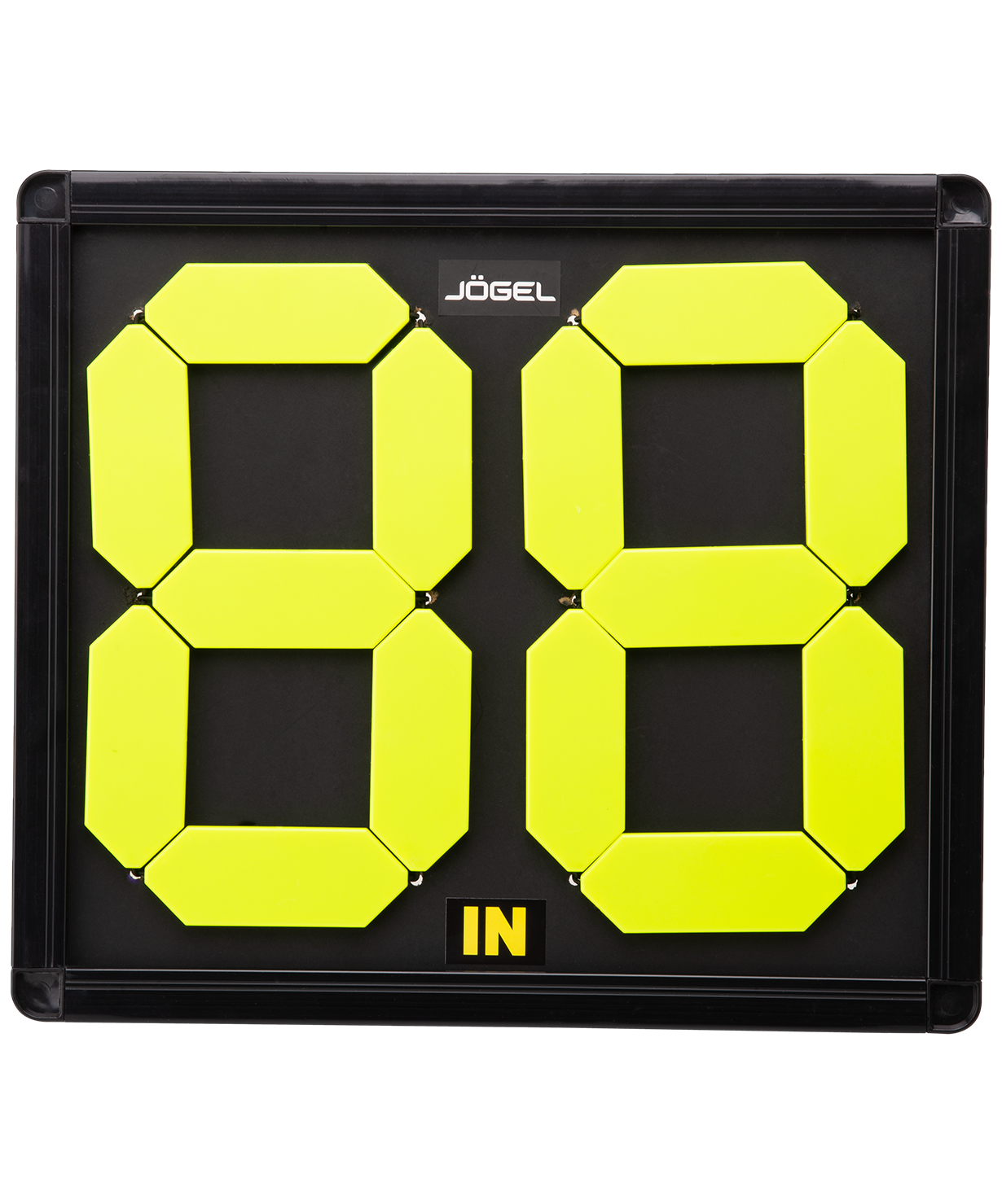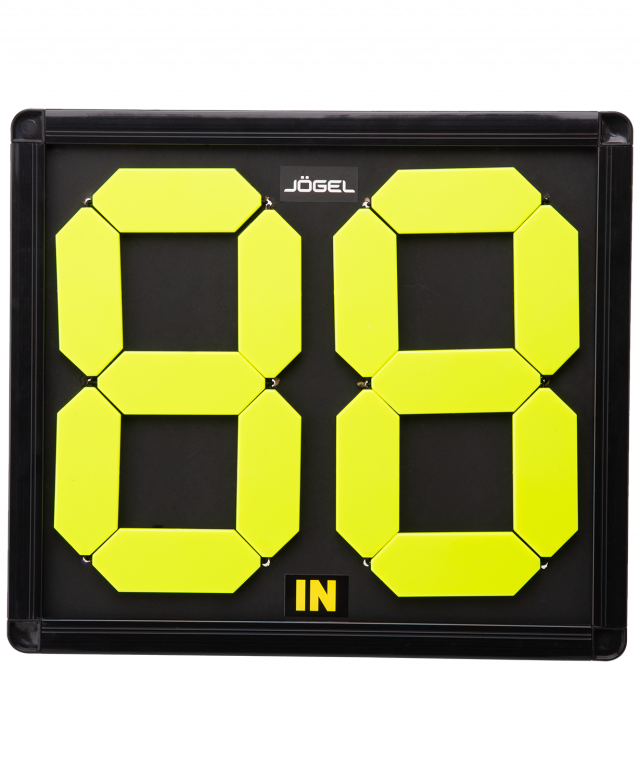 Двусторонее табло для замены игрока Jögel. Механическое управление. Сегменты каждого разряда поворотные, выкрашены в яркий цвет и заметны издалека. Каркас выполнен из прочного материала.