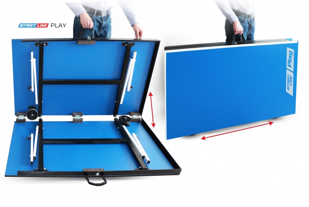 Новая разработка конструкторов Start Line представлена компактным столом для игры в помещении. Теннисный стол легко складывается до минимальных размеров. В сложенном виде помещается внутри багажника большинства автомобилей и занимает при хранении на 85% меньше места, чем стандартные столы. Размер теннисного стола в разложенном виде соответствует международному стандарту. Регулируемая высота боковых опор дает возможность выставить уровень игрового поля даже на неровной поверхности. Специальные надежные фиксаторы закрепляют положение как в разложенном, так и в сложенном виде. Наличие маневровых колес облегчает перемещение стола в нужную зону с помощью переносных ручек.