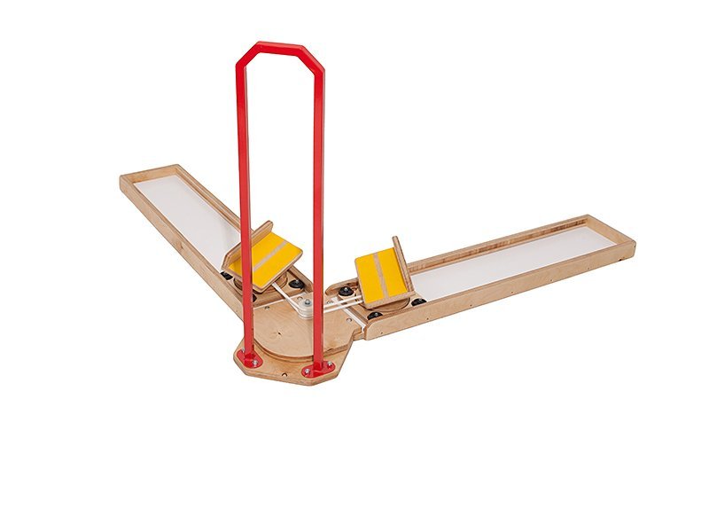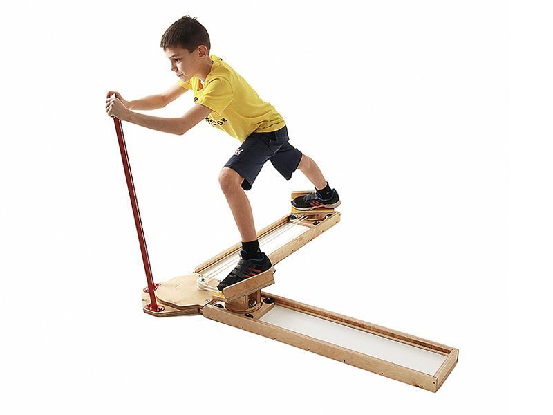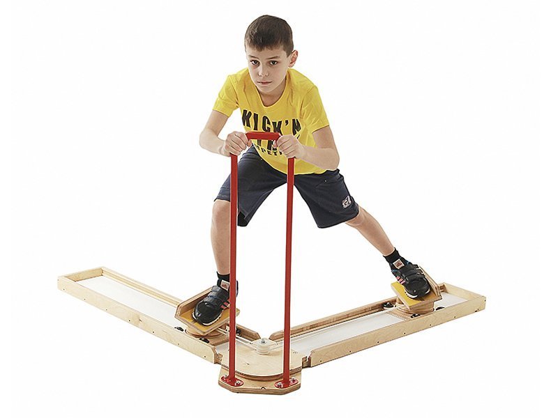 Это экономичный, малогабаритный тренажер, предназначенный для использования детьми. Тренажёр предназначен для обучения детей правильной механике катания на коньках. Тренажер снабжен страховочной конструкцией в виде стойки держателя, которая позволяет детям на начальном периоде обучения не отвлекаться на сохранение устойчивости и выработку координации. Специализированные тележки скользят по направляющим корпуса, испытывая противодействие со стороны кордов-натяжителей, изготовленных из наборной резины и заключенных в прочную синтетическую оболочку. Конструкция тележек, подразумевает постановку стопы ребенка под углом в 45 градусов, что держит открытой внутреннюю сторону бедра обеих ног, создавая при возвратном движении толчковой ноги положение старта. Тележки не имеют жёсткого крепления к направляющей конструкции корпуса, что создаёт полную имитацию состояния голеностопа ребёнка обутого в конёк. Очень хорошо развивает мышечную память.