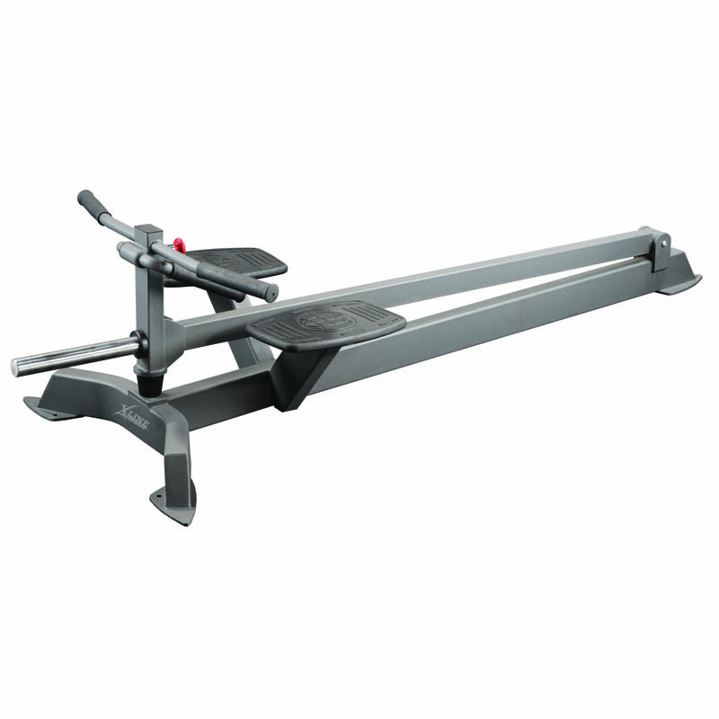 тренажер — т-образная тяга с упором на ноги (свободные веса).