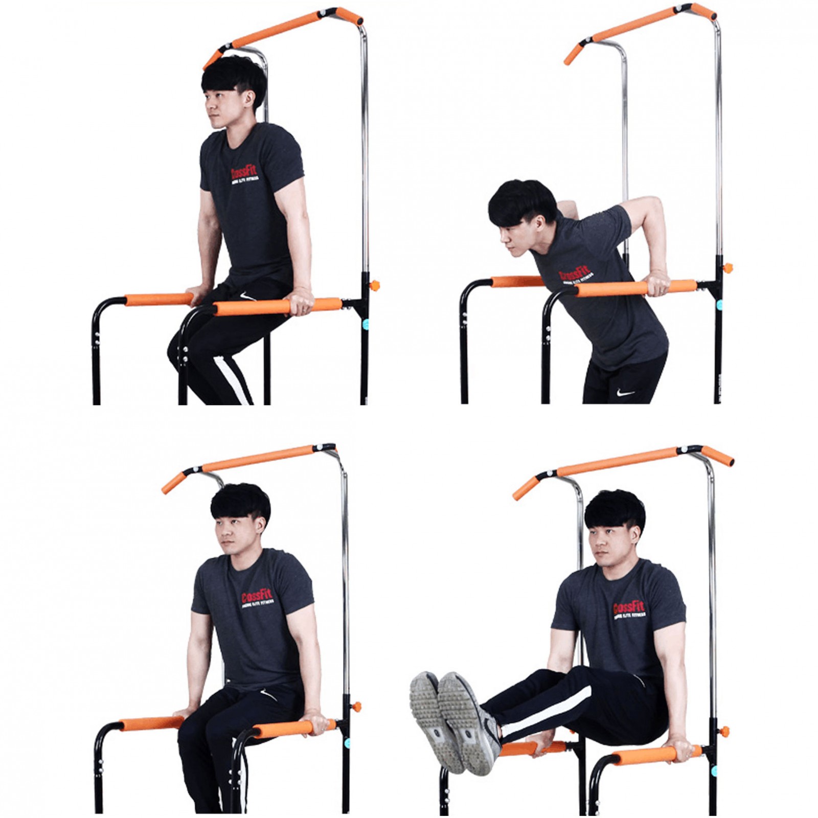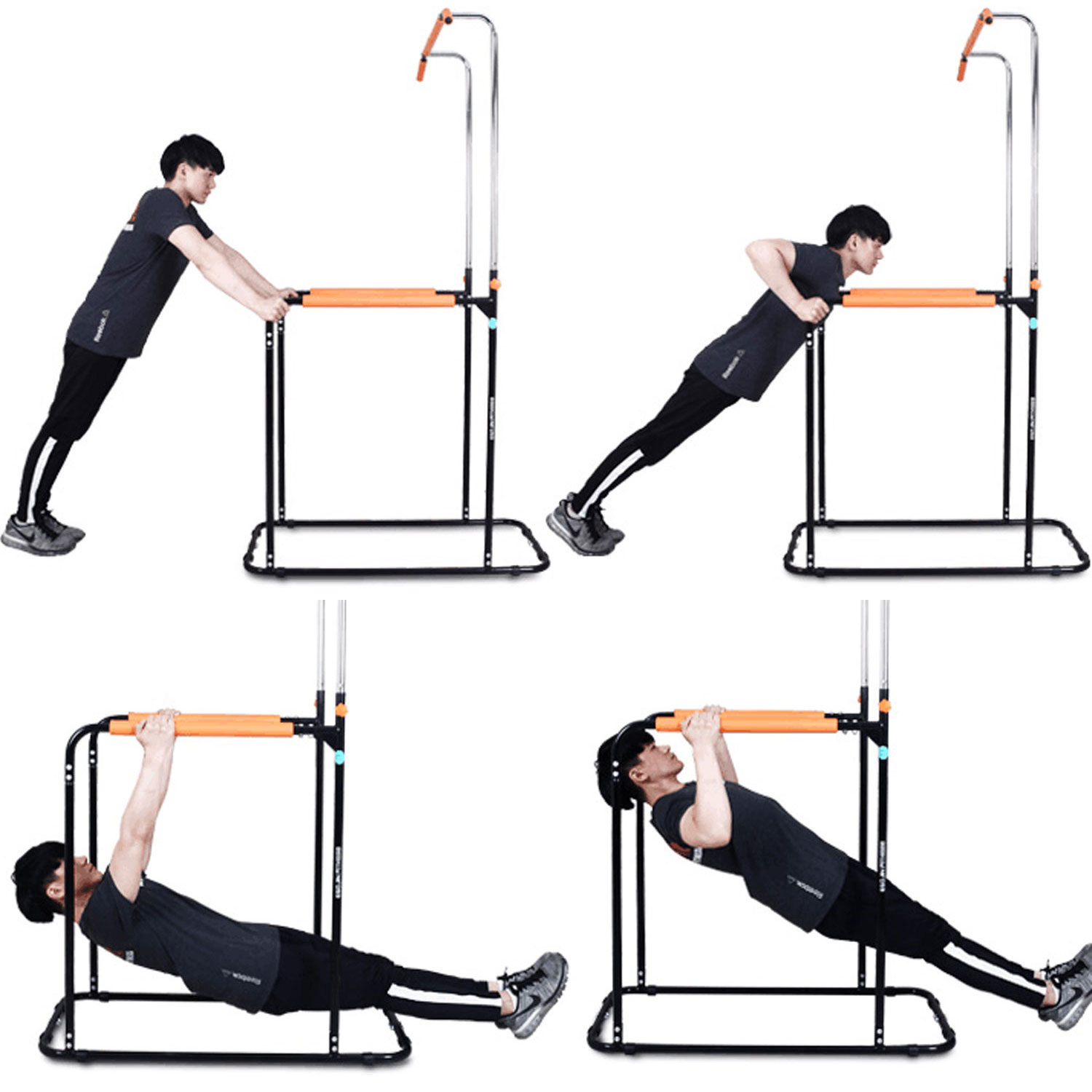Тренажер предназначен для выполнения 3 типов упражнений: подтягивания на турнике, отжимания на брусьях, и прокачки пресса, воздействуя на разные группы мышц тела на одном тренажере. Занятия на этом тренажере способствуют развитию мышц рук, плечевого пояса, спины и пресса.