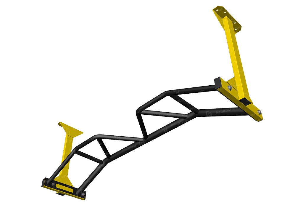 Турник имеет разборную конструкцию и изготавливается из толстостенных металлических труб для повышенной прочности и устойчивости к нагрузкам до 150 кг. Крепление к потолку осуществляется с помощью 8 входящих в комплект шурупов под шестигранник. Окрашен высококачественной порошковой краской.