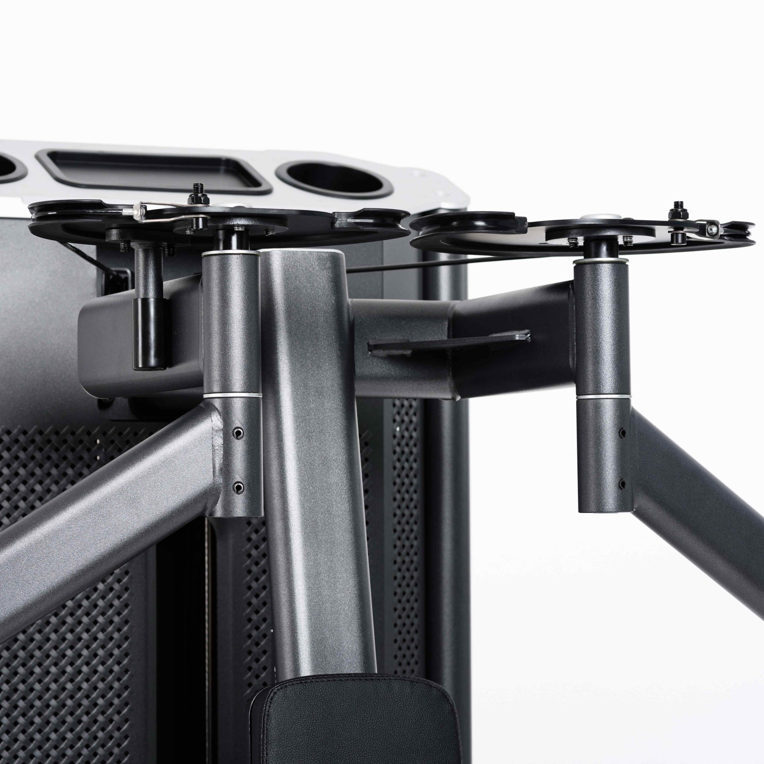 Металлическая перфорированная защита весового стека с лицевой стороны и сплошная защита с задней стороны выполнена из листового металла толщиной 2 мм. Ребра жесткости у основания, примыкающие к несущей раме через скрытое болтовое соединение сечением 6 мм в восьми точках, повышают эксплуатационные параметры тренажера.