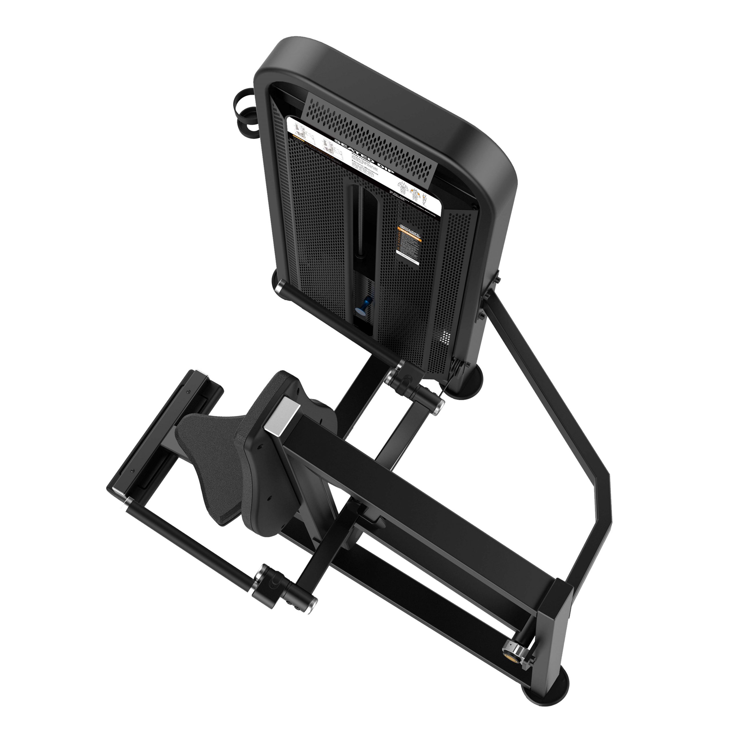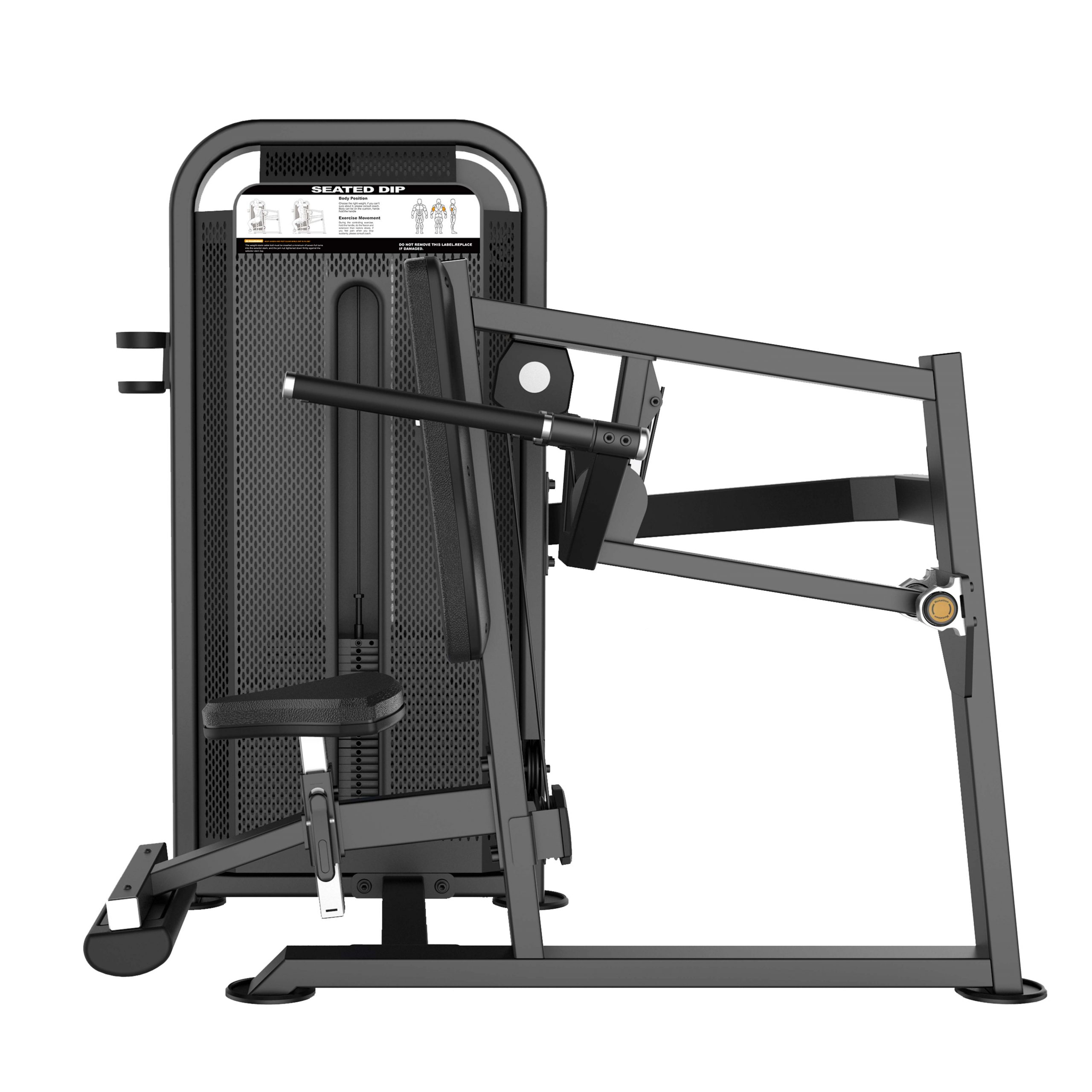 Тренажер предназначен для выполнения упражнения на развитие широчайших мышц спины, трицепса и мышц грудной клетки. Выполняемое движение: жим вниз, естественная имитация рабочих движений при отжимании на брусьях.