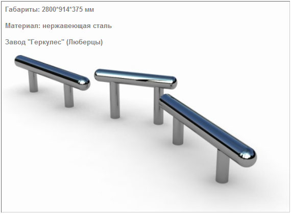 Материалы: Нержавеющая сталь. Конструкция имеет радиальные загибы (округление), выполненные для увеличения прочности конструкции. В комплект тренажера входит элемент закладного фундамента.