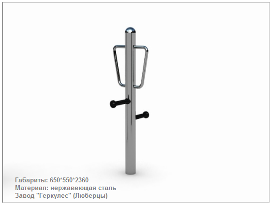 Материалы: Нержавеющая сталь. Все узлы вращения оснащены подшипниками. Конструкция имеет радиальные загибы (округление), выполненные для увеличения прочности конструкции. В комплект тренажера входит элемент закладного фундамента.