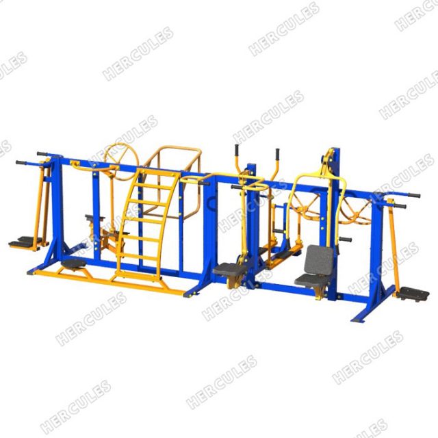 Тренажерный комплекс предназначен для занятий людей без физических ограничений а также людьми с нарушениями опорно-двигательного аппарата (в кресло-колясках). Состав тренажеров: А. Маятниковый тренажер. Предназначен для разминки мышц спины и живота. Возьмитесь за рукояти, поочередно поставьте ноги на подвижную платформы и выполняйте маятниковые движения ногами. Б. Жим от груди. Предназначен для тренировки мышц верхнего плечевого пояса, мышц груди. Сядьте на сидение, возьмитесь руками за рукояти, выполните жим от себя. В качестве нагрузки используется собственный вес спортсмена В. Вертикальная тяга. Предназначен для тренировки мышц верхнего плечевого пояса, мышц груди. Сядьте на сидение, возьмитесь руками за рукояти, выполните тягу к себе и вниз. В качестве нагрузки используется собственный вес спортсмена Г. Пресс-скамья. Предназначен для тренировки мышц брюшного пресса. Спиной к тренажеру, возьмитесь руками за верхнюю перекладину и выполняйте подъем и опускание ног. Д. Твистер. Предназначен для разминки мышц живота и спины. Е. Сведение и разведение ног. Предназначен для тренировки отводящих и приводящих мышц бедра. Возьмитесь за рукояти, поочередно поставьте ноги на ногоступы, разводите и сводите одновременно обе ноги. Ж. Степпер. Предназначен для тренировки мышц ног и создания кардионагрузки. Возьмитесь за рукояти, поочередно поставьте ноги на ногоступы, выполняйте шагательные движения З. Брусья. Предназначены для тренировки мышц рук. И. Лыжный ход. Предназначен для разминки мышц ног и создания кардионагрузки. Возьмитесь за рукояти, поочередно поставьте ноги на ногоступы, выполняйте движения подобно лыжнику. К. Рули. Предназначены для разминки мышц рук. Возьмитесь руками за один или два руля, выполняйте рулями вращательные движения одно или разнонаправленные.
