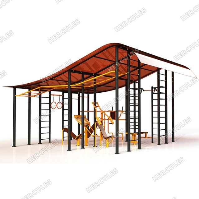 Уличный спортзал под навесом. Длинная стальная силовая рама. Крыша — сотовый поликарбонат. Навесное оборудование: 1) рукоход — 1 шт.; 2) кольца гимнастические — 1 шт.; 3) брусья