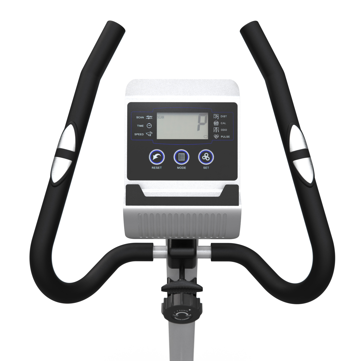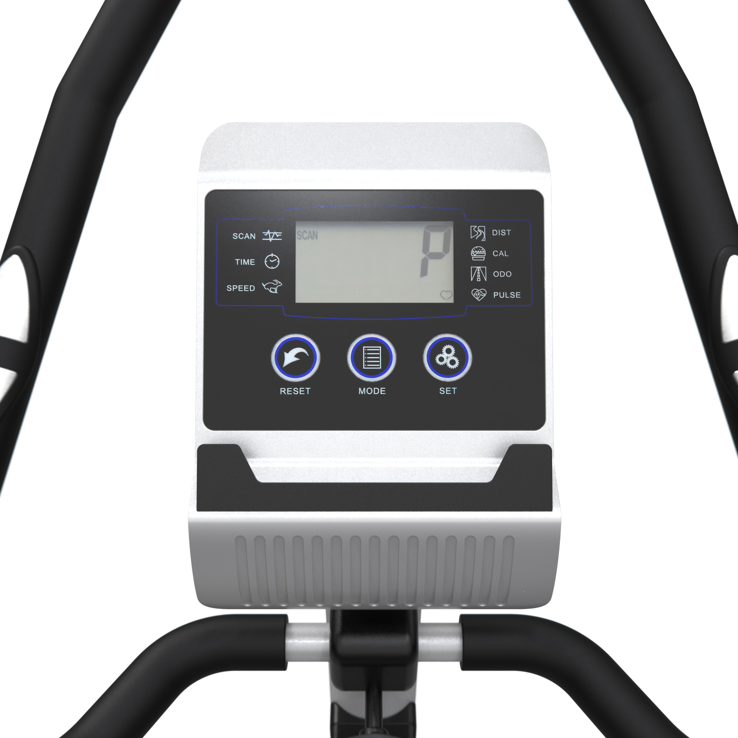 Широкие педали с регулируемыми ремешками и однокомпонентный шатун обеспечивают надежную поддержку ног во время тренировок. Дисплей монохромный LCD с подсветкой, а на нем отображаются следующие показатели: скан, время, скорость, расстояние, калории, пульс, восстановление пульса (recovery). Язык интерфейса — английский.