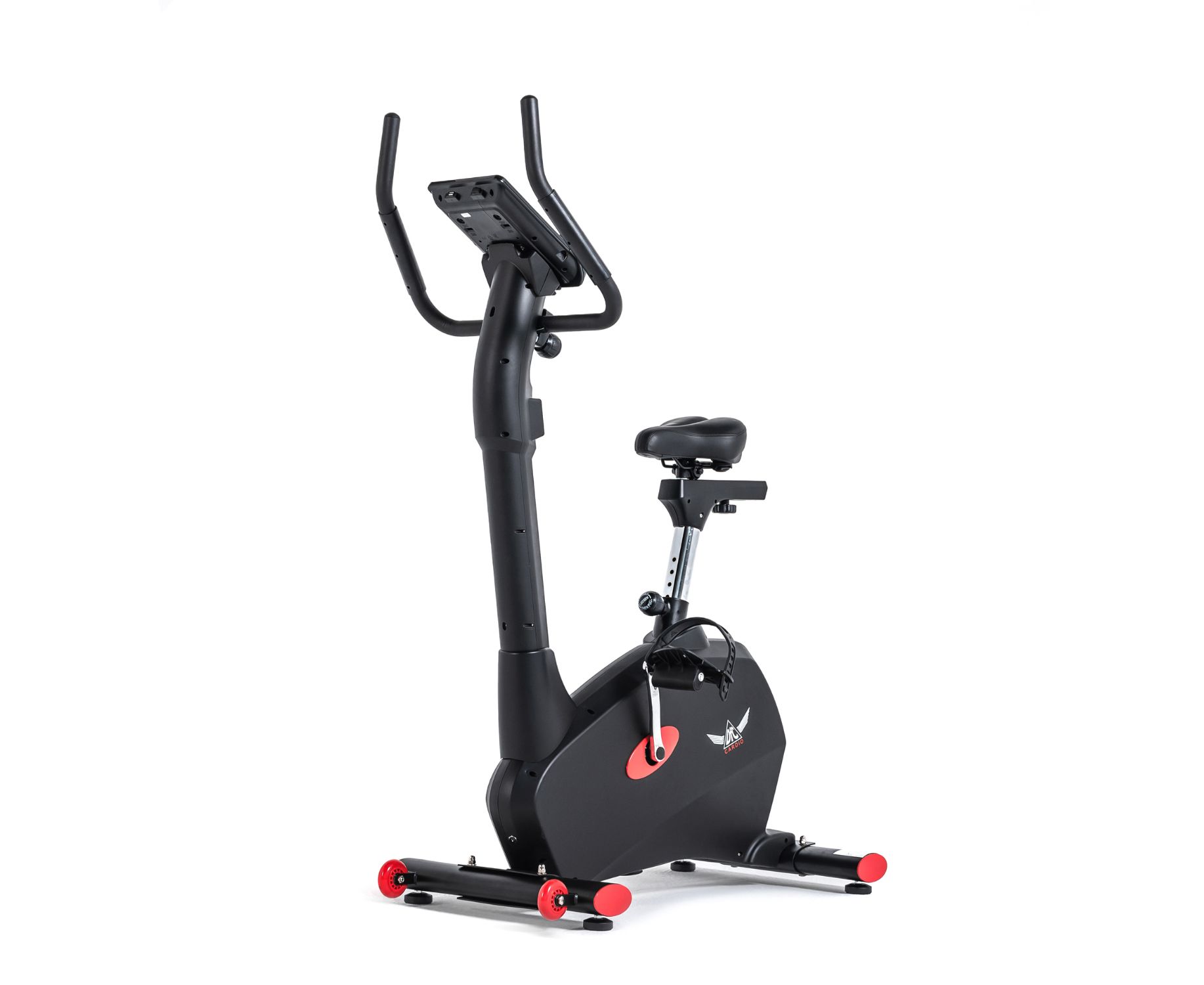 Тренажёр выполнен в стильном дизайне: бархатный чёрный цвет «разбавляют» ярко-красные вставки. Эта модель отмечена и логотипом производителя: крылатым значком DFC Cardio на боковой панели велотренажёра.