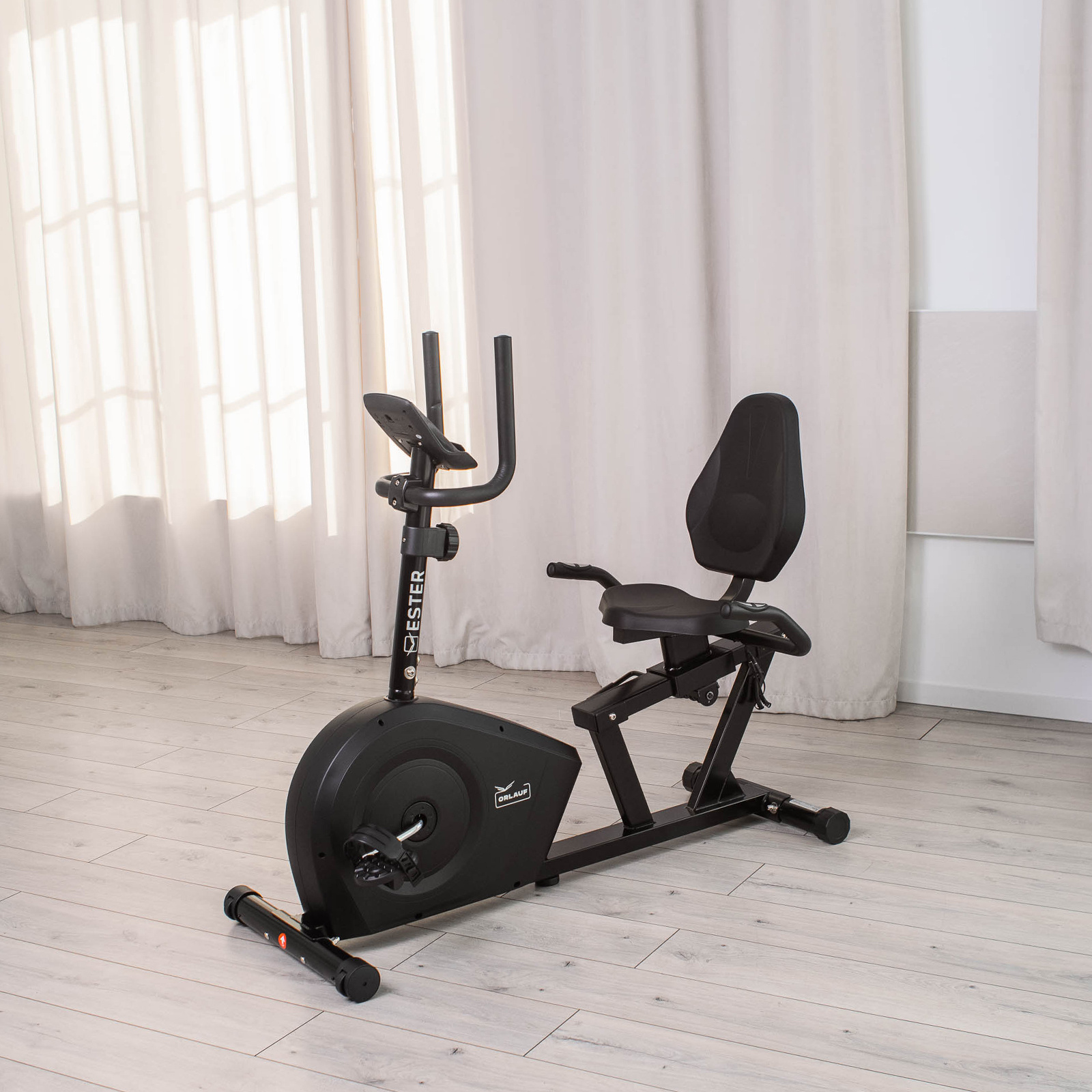 За показатели пульса отвечают вмонтированные в рукоятки сенсорные датчики пульса. Велотренажер удобно перемещать благодаря двум транспортировочным роликам, а точное горизонтальное положение обеспечивают компенсаторы неровностей пола. Черно-белый LCD-дисплей диагональю 9 см одновременно выводит на экран различные параметры тренировки — время, дистанцию, скорость, калории, обороты в мин., пульс. Помимо этого, здесь предусмотрена функция фитнес-теста (Recovery) — она позволяет быстро оценивать тренированность человека и определять, насколько хорошо развита его сердечно-сосудистая и дыхательная системы. Конструкция рамы рассчитана на комфортную тренировку пользователей ростом до 195 см и весом до 130 кг.