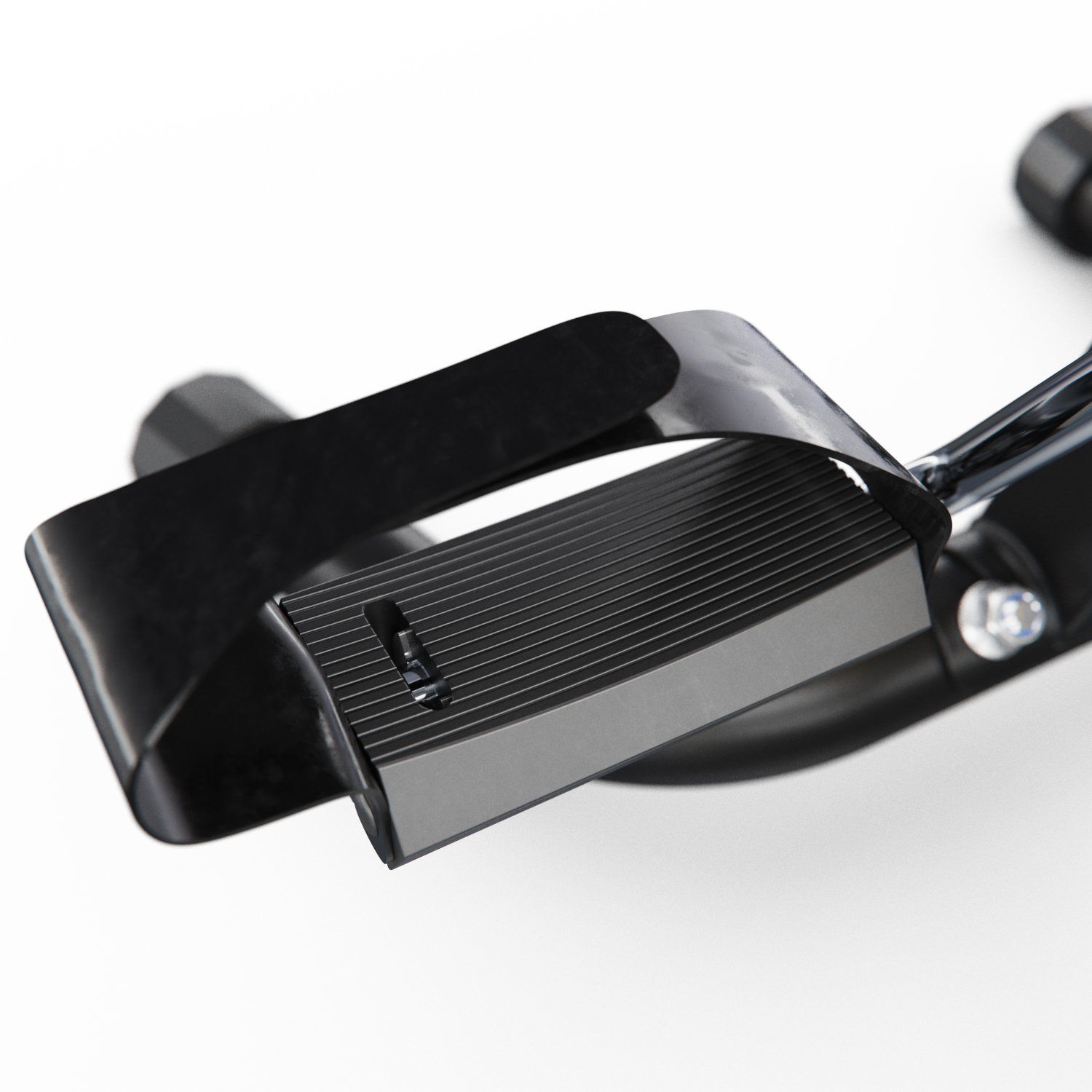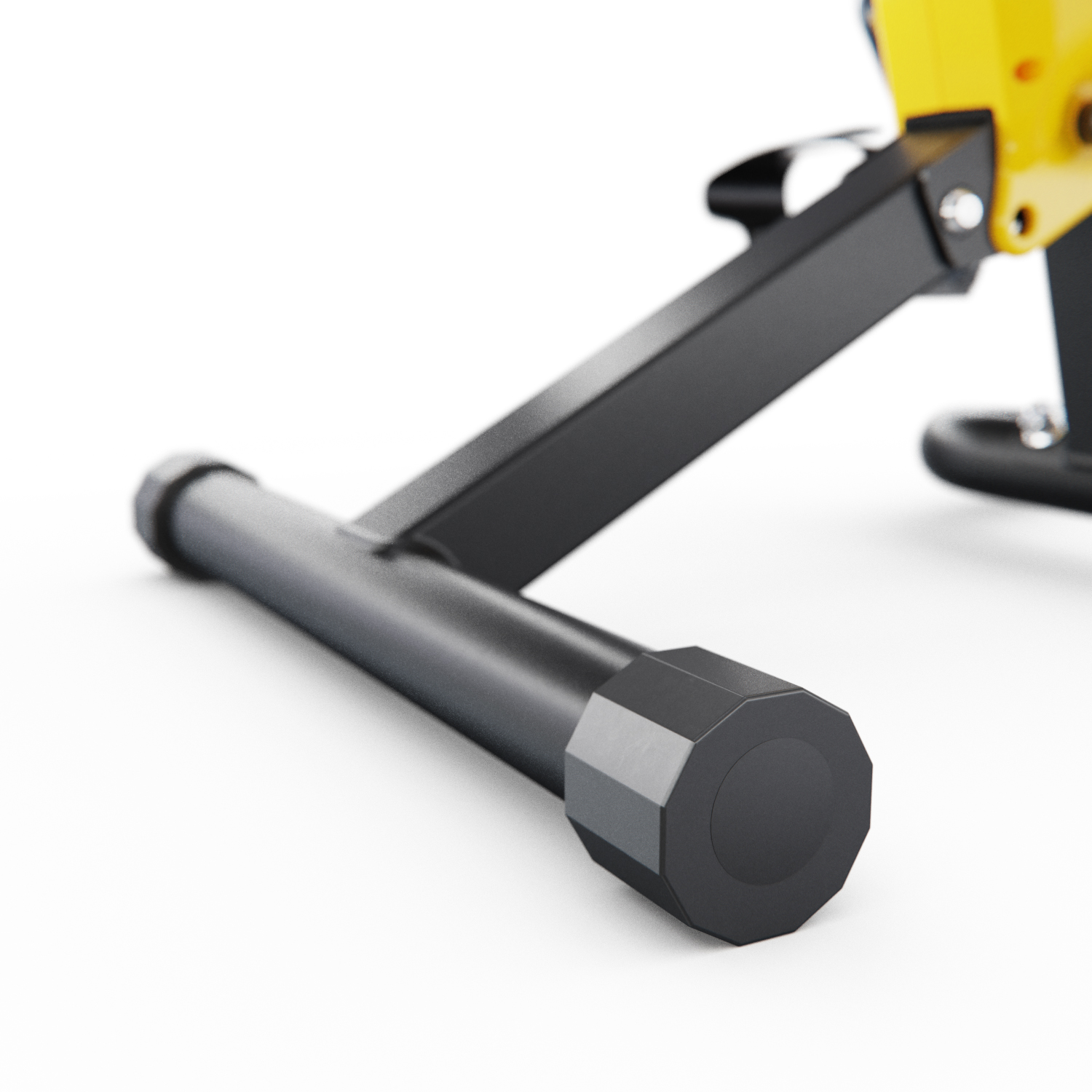 Конструкция велотренажёра складная. Длина эспандеров 70 см, а профиль рамы толщиной 1,2 мм. Педали с регулируемыми ремешками на липучках. На ножках расположены резиновые накладки для защиты от скольжения и царапания поверхности пола, а также компенсаторы неровности пола.