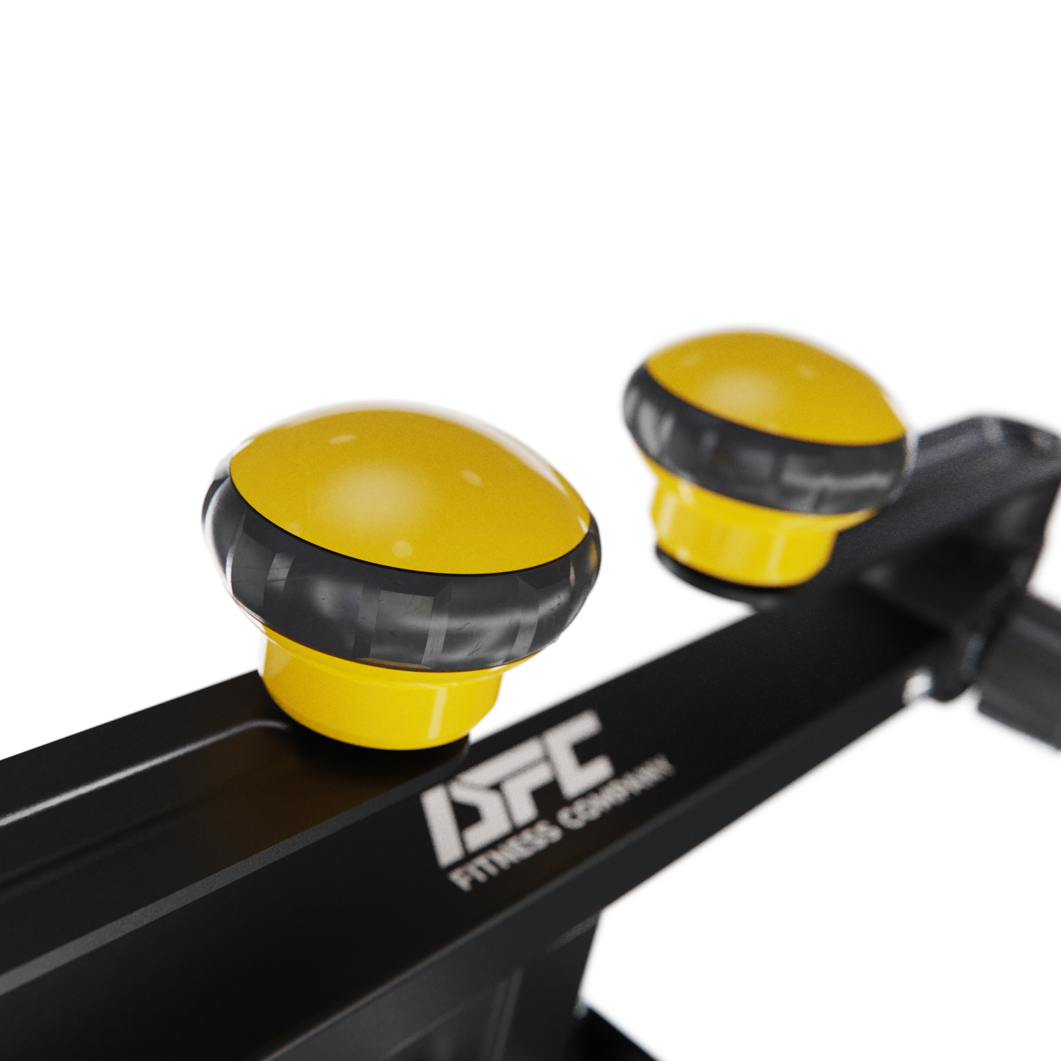 Велотренажёр двойной DFC B815Y с накладками и ручками жёлтого цвета. Система нагрузки трубочная, регулировка нагрузки механическая.