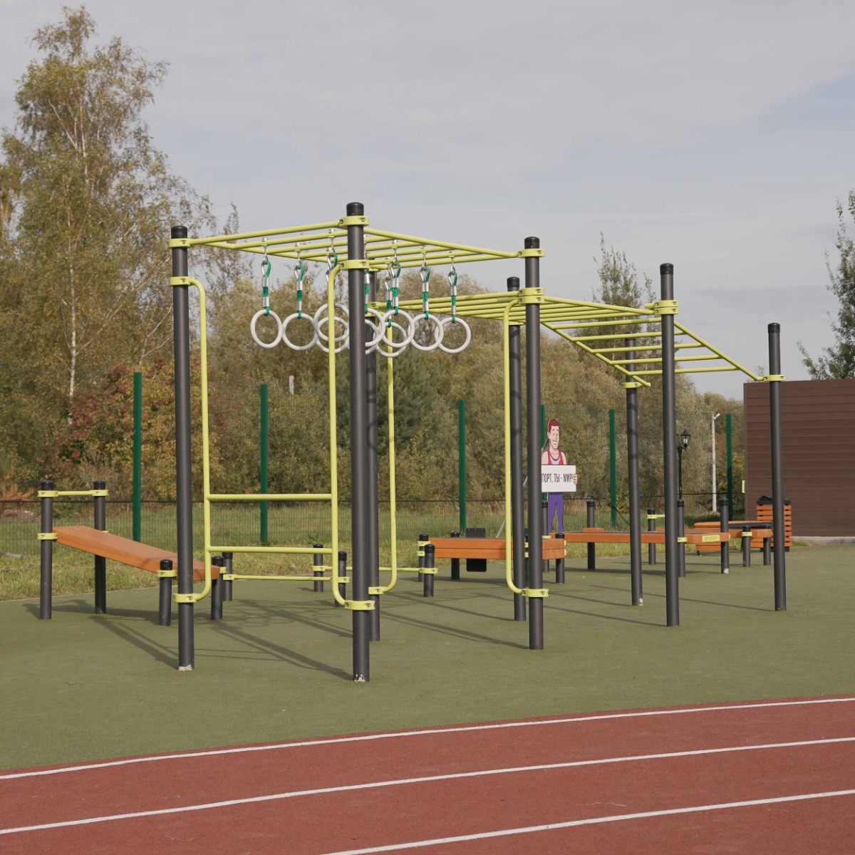 Рукоходы классический и в подъём, рукоход с кольцами, перекладины вертикальные и низкая шведская стенка выполнены из металлической трубы диаметром 34 мм с толщиной стенки 3,2 мм.