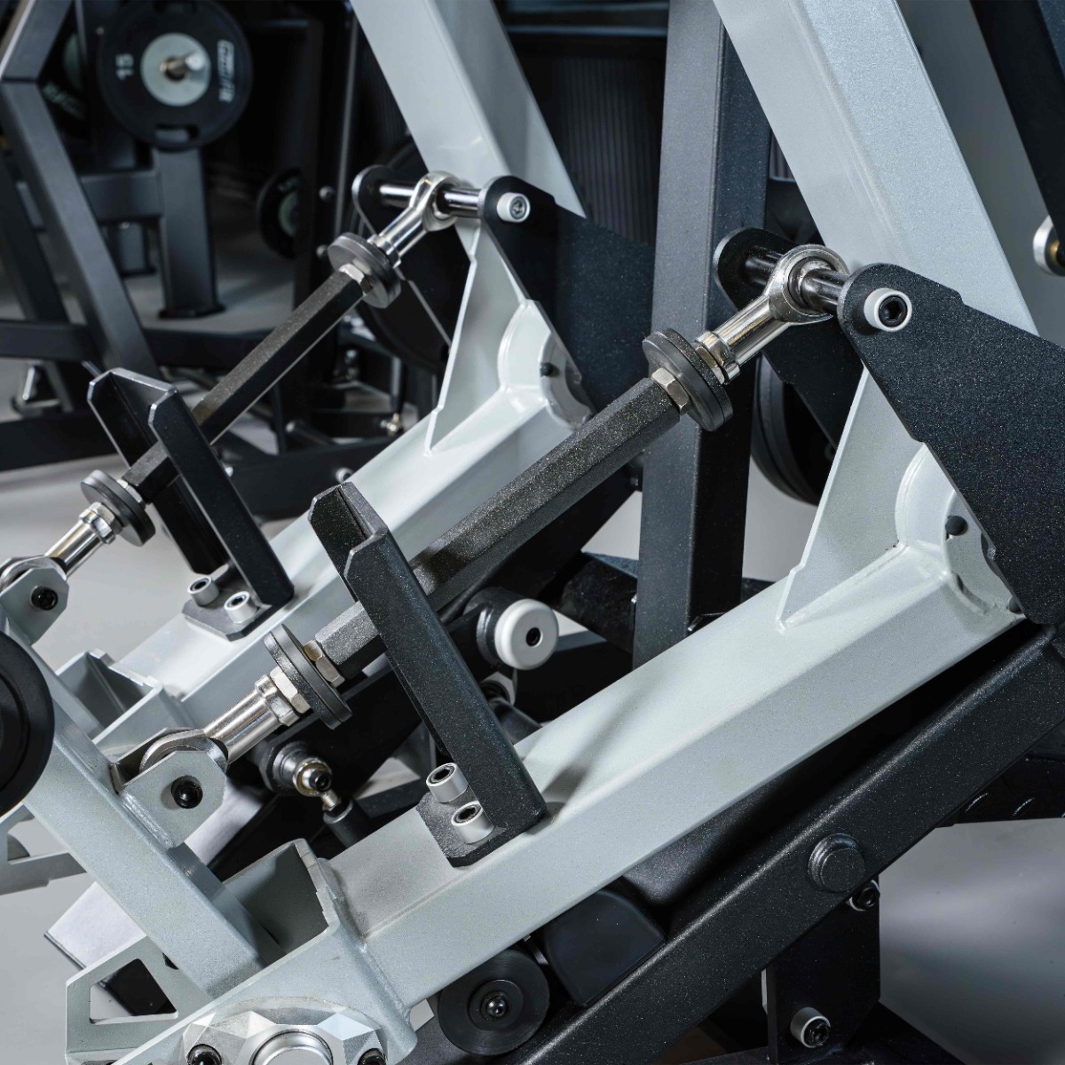 На подвижных рычагах для работы со свободными весами установлено два литых хромированных накопителя из толстостенной стальной трубы длиной 300 мм для дисков с посадочным диаметром 50 мм.