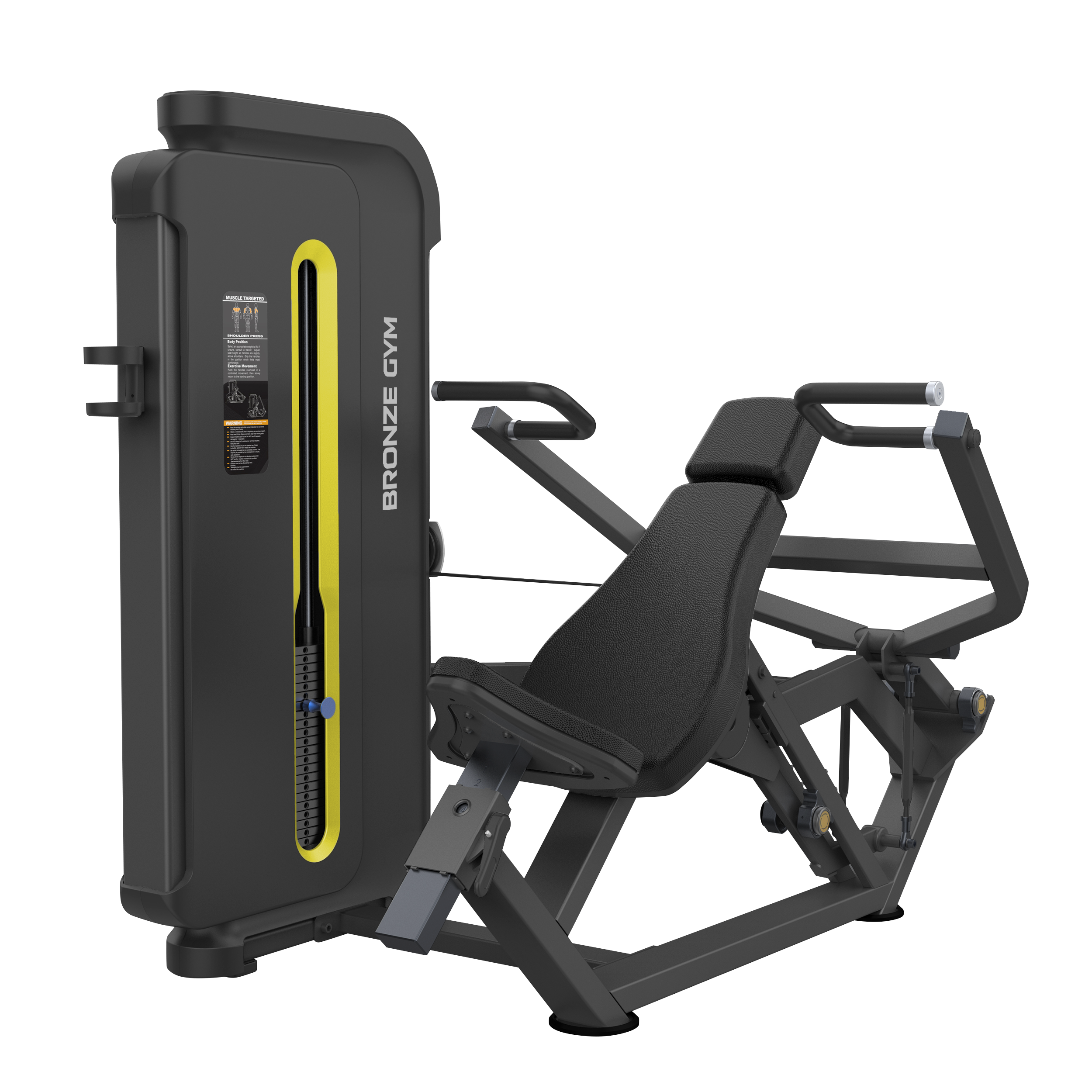 BRONZE GYM BW-3006 — это профессиональный тренажер коммерческого класса для выполнения упражнения жим на плечи. Благодаря данной модели, пользователь сможет проработать мышцы плеч и дельтовидные мышцы. Рама BW-3006 с внушительными размерами 100*50 толщиной 2.5 мм и порошковой окраской в два слоя, выражает силу с первого взгляда. Прорезиненные, нескользящие рукоятки оборудования обеспечивают надежное сцепление рук пользователя во время занятий, что избавит от риска получения травм. Стальной трос в ПВХ оболочке общим диаметром 6 мм отвечает за подъем грузов. Между прочим, это один из самых высоких показателей в классе. Весовые плиты изготовлены из прочной легированной стали. Общий вес стека составляет 110 кг. Для простоты использования, все фиксаторы на тренажере выполнены в ярких цветах.* Это очень важная деталь, особенно для слабовидящих пользователей. Установленное на модели эргономичное сиденье из искусственной кожи гарантирует повышенный комфорт пользователя на протяжении всех подходов при выполнении упражнения. Мягкость обеспечивают подушки с полиуретановым наполнителем. Сиденье регулируется по вертикали. В качестве дополнения BRONZE GYM BW-3006 оснащен держателем для бутылочки с водой и полотенца.